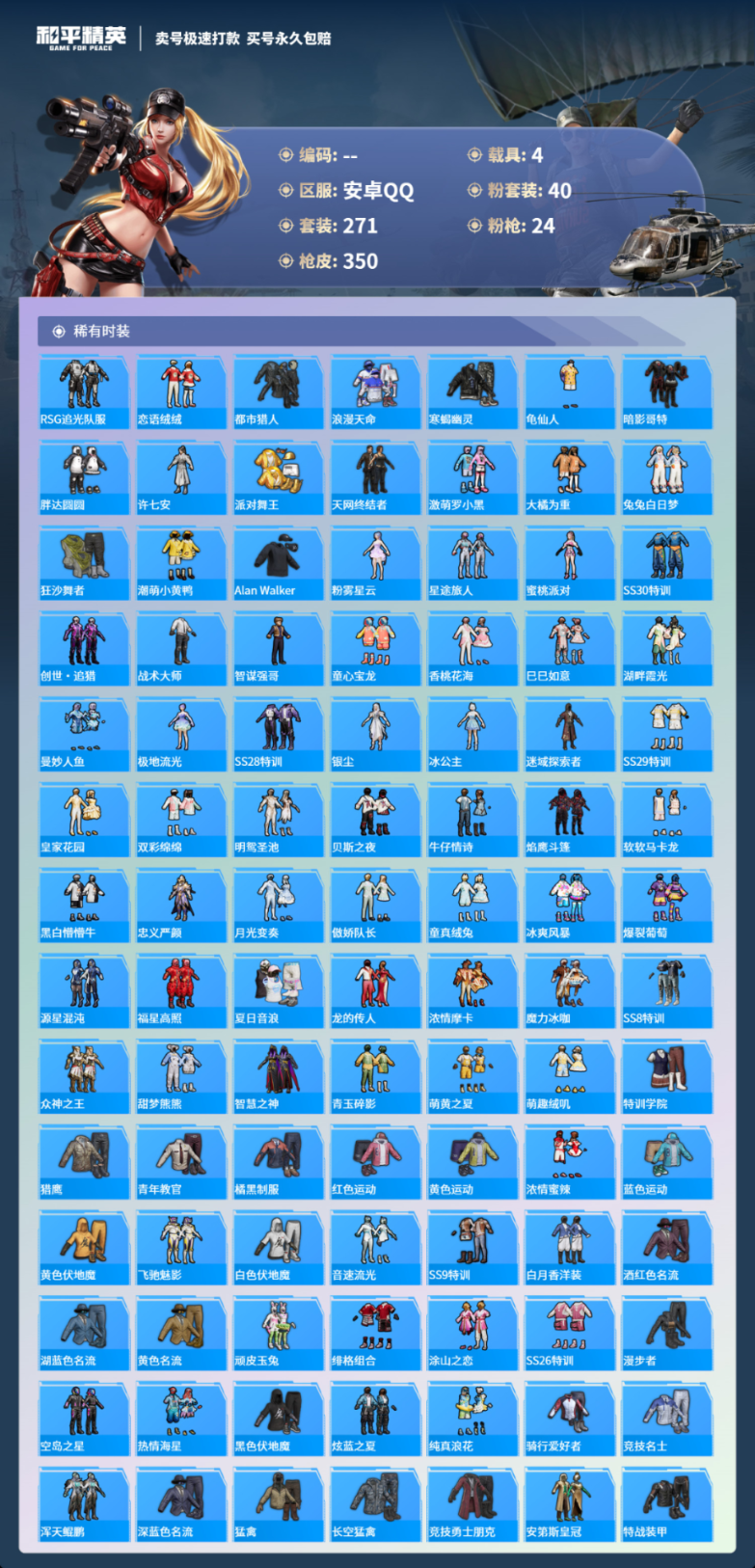 4载具271套装-350枪皮-安卓手Q-15王牌印记-有战神框-40粉装-24特效枪-4载具-热力值-271套装-350枪皮-5卓越印记-4传奇印记