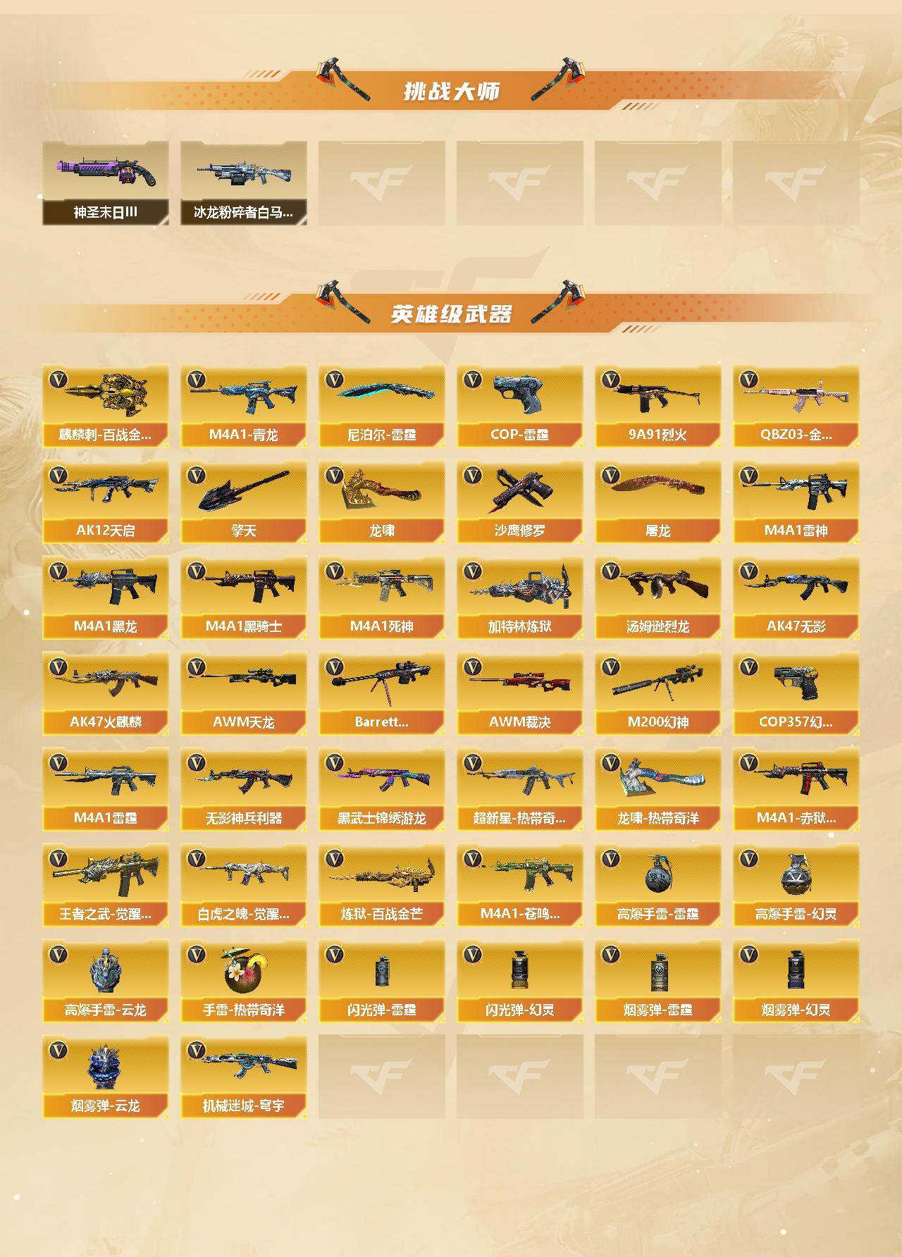 【热门武器】:QBZ03-金色蔷薇,M4A1-青龙,M200-幻神,QBZ03-街机,M4A1-黑骑士,汤姆逊-烈龙*5,加特林-炼狱,COP 357-幻灵,沙鹰-修罗*3,黄金猫猫手套-白鲨,金刚伞