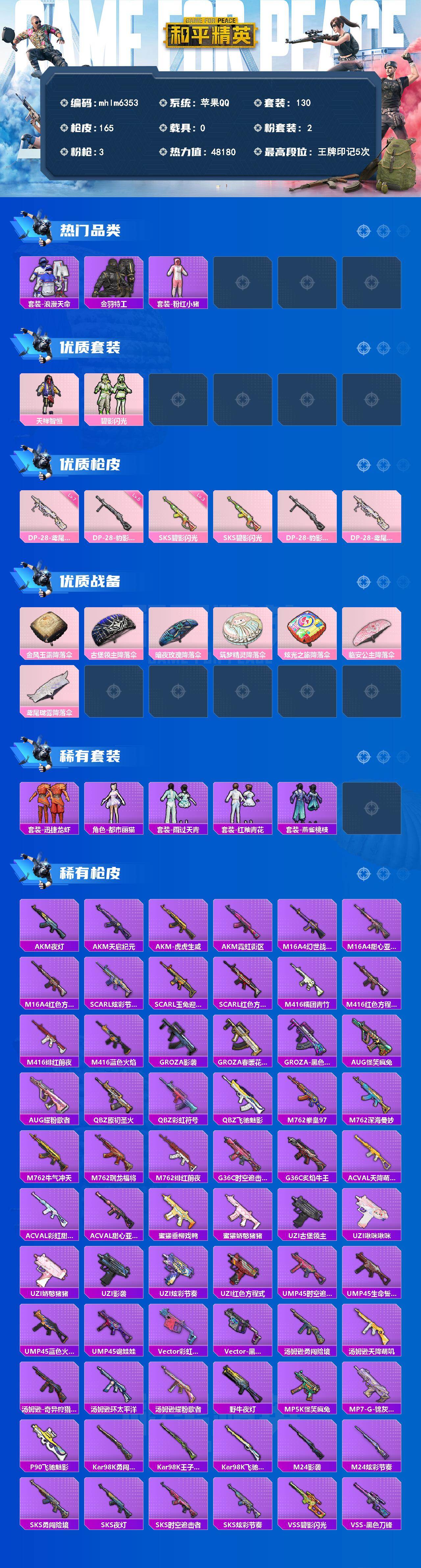 【mhlm6353】苹果手Q-2粉装-3特效枪-48180热力值-5王牌印记-130套装-165枪皮