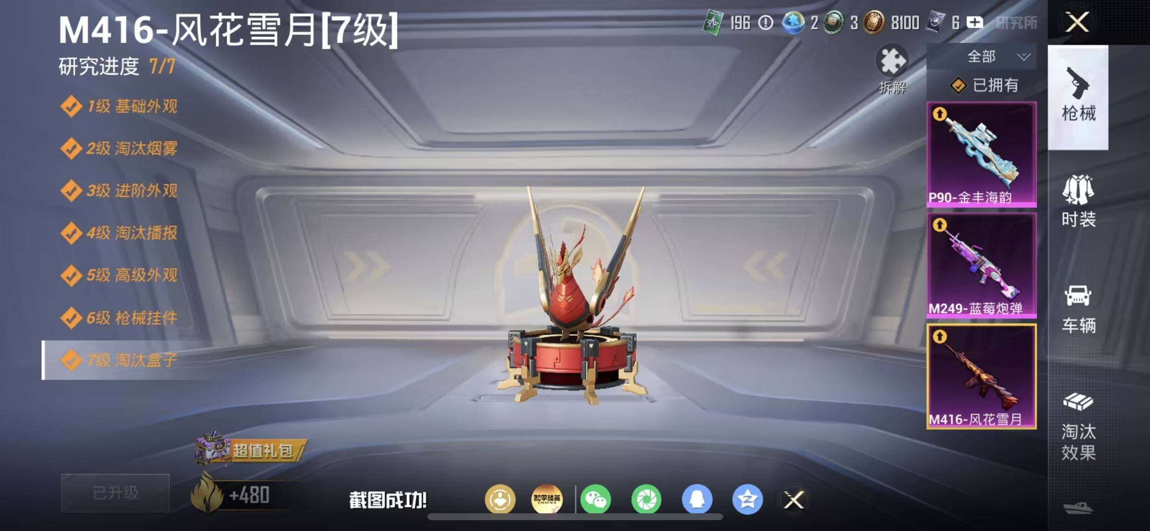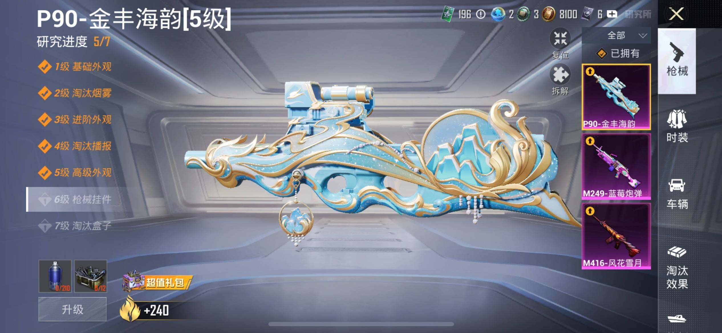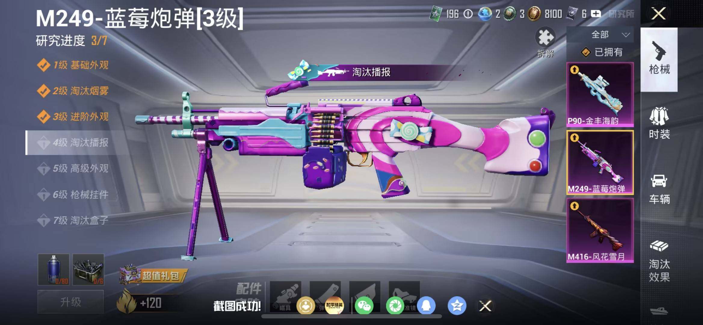【粉色枪皮等级】:M416-风花雪月(七级),P90-金丰海韵(五级),M249-蓝莓炮弹(三级)