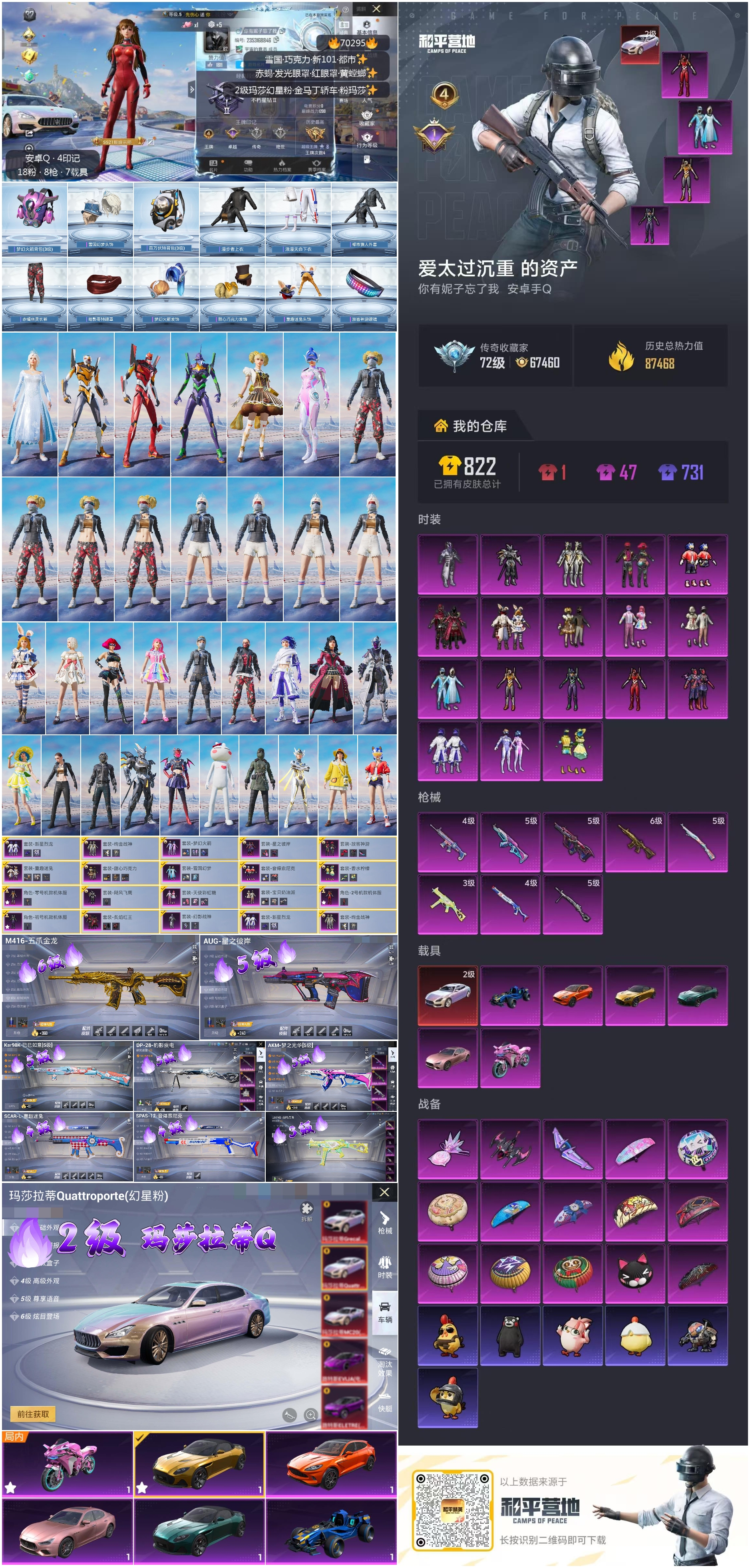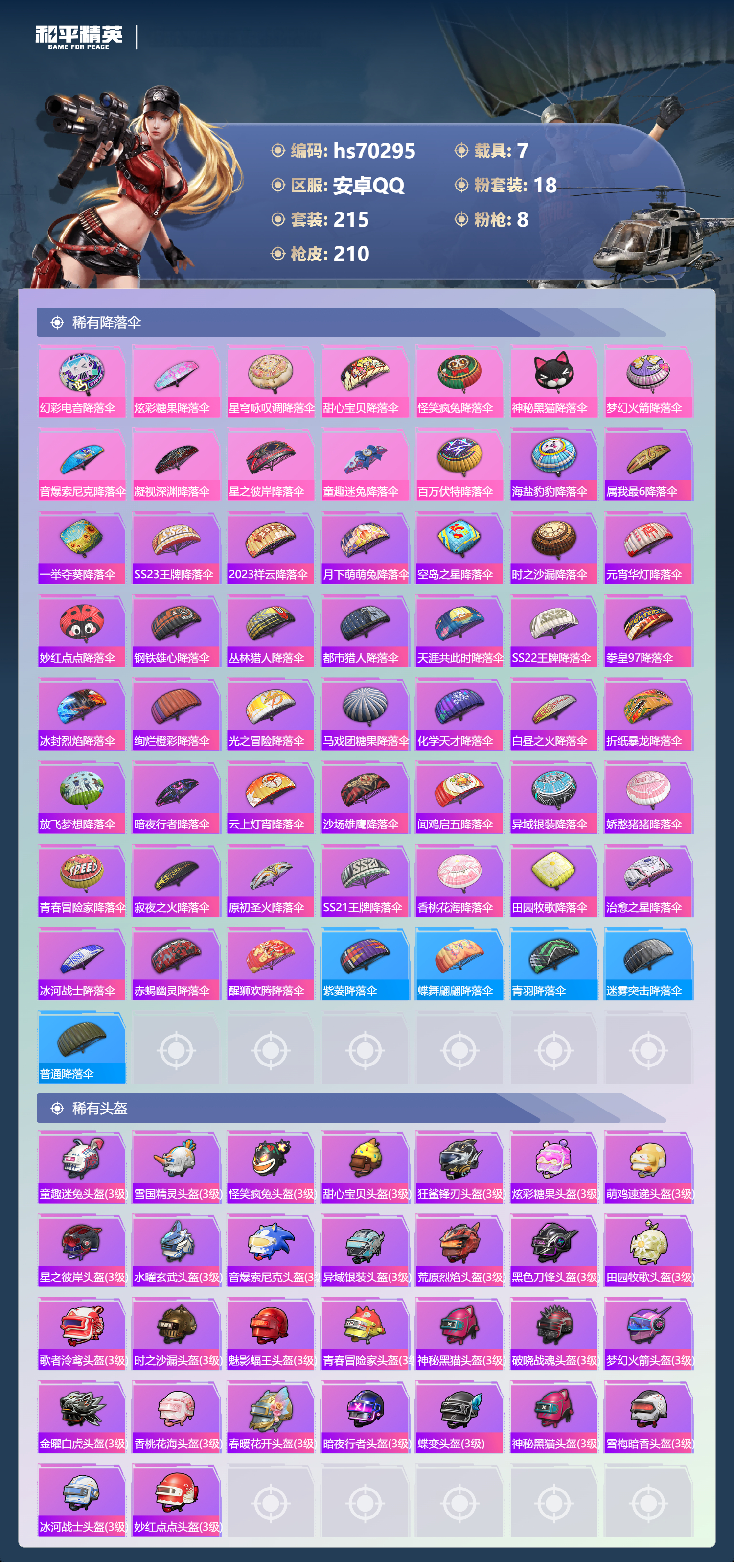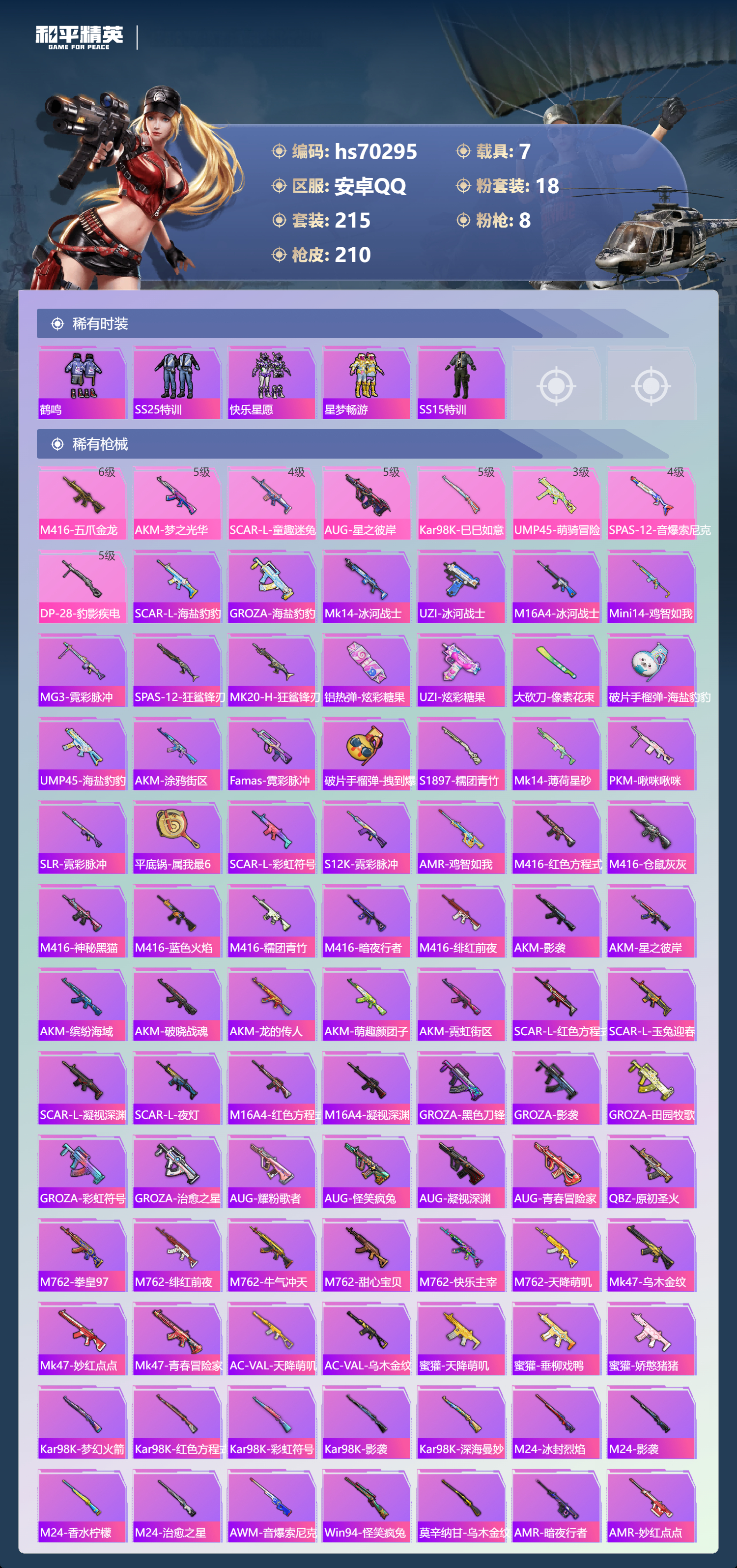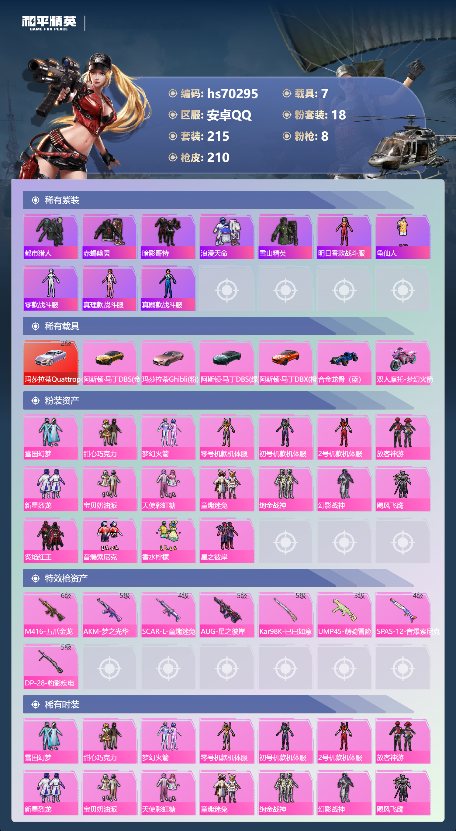 hs70295 安卓手Q-4王牌印记-18粉装-8特效枪-7载具-87523热力值-215套装-210枪皮-1卓越印记