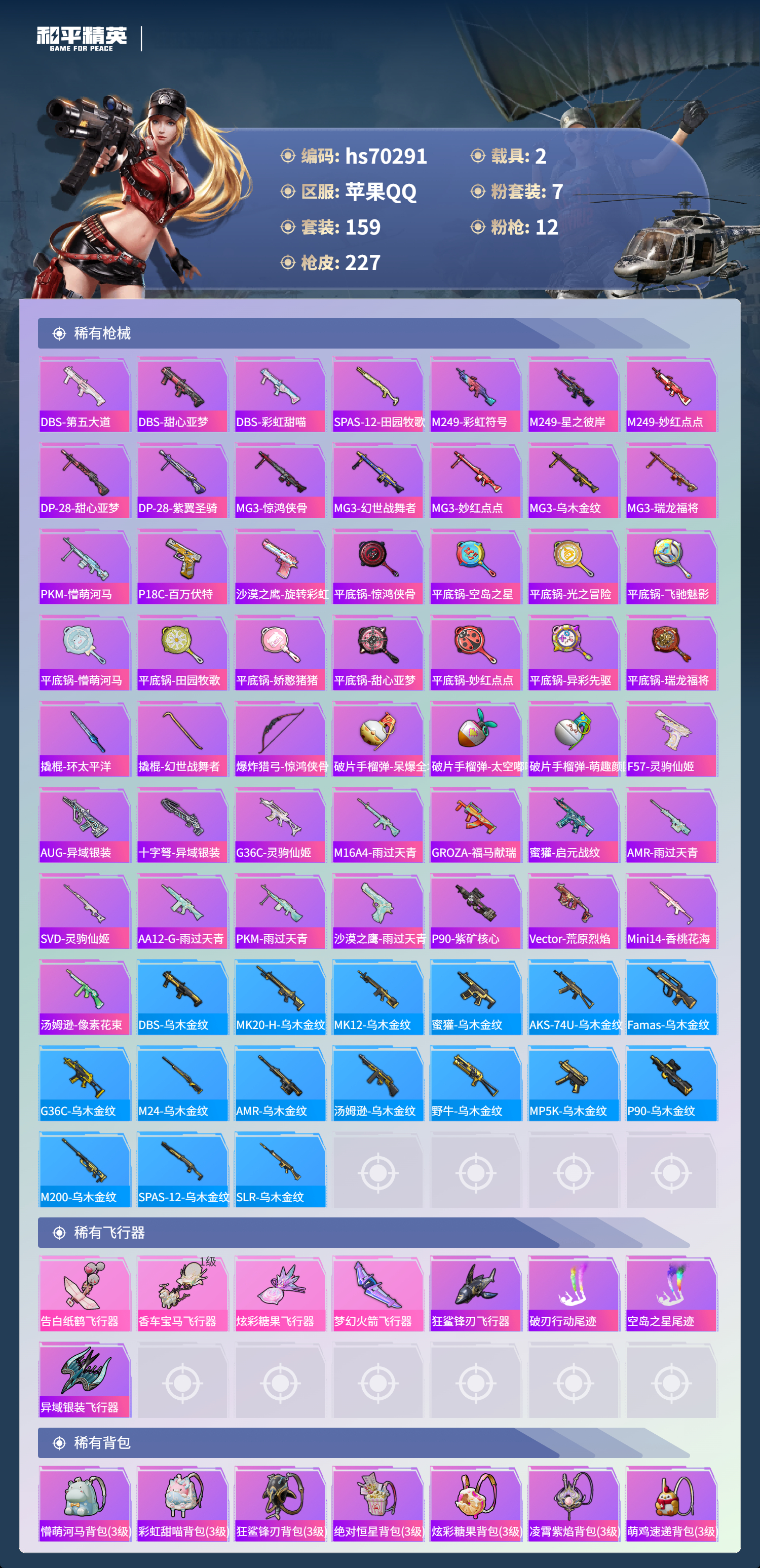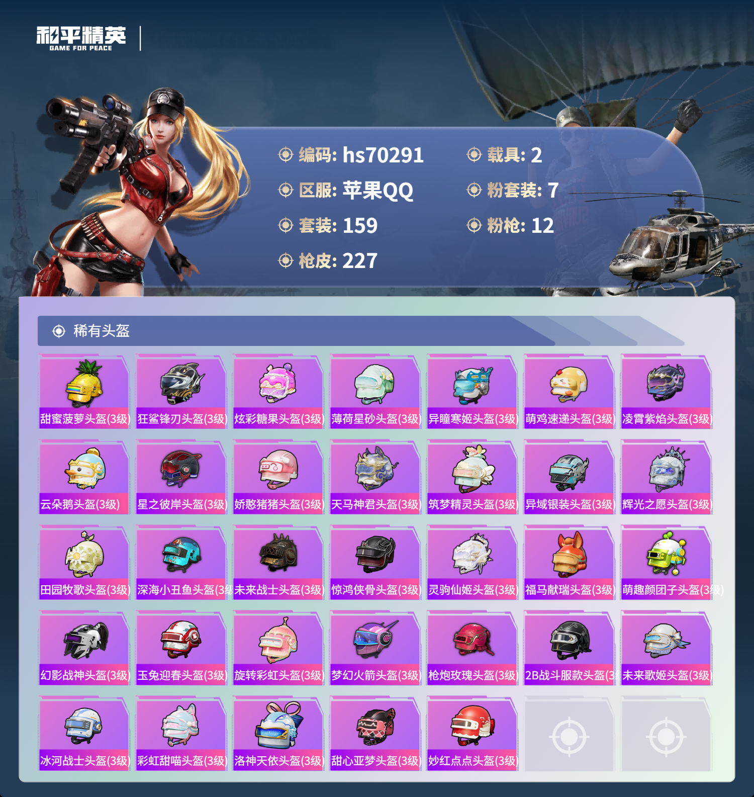 hs70291 苹果手Q-16王牌印记-7粉装-12特效枪-2载具-73446热力值-159套装-227枪皮-3卓越印记