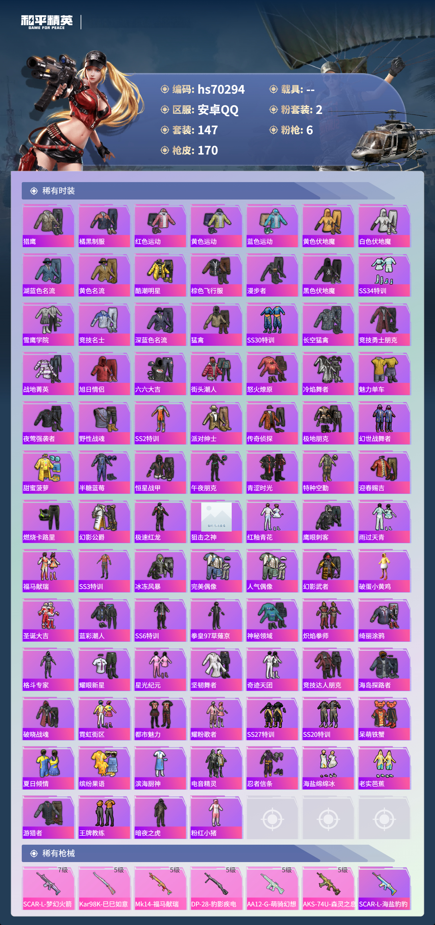 hs70294 安卓手Q-13王牌印记-2粉装-6特效枪-47504热力值-147套装-170枪皮-1卓越印记