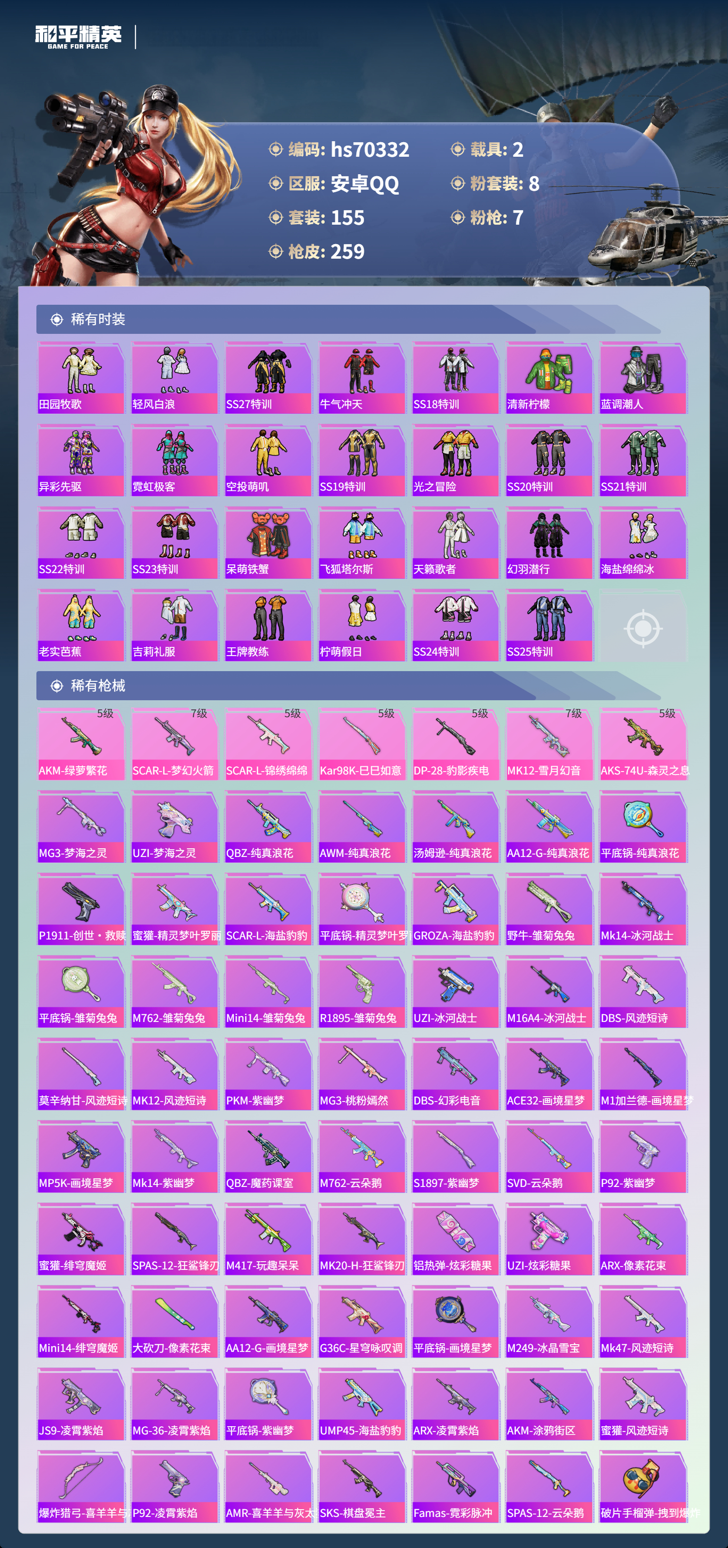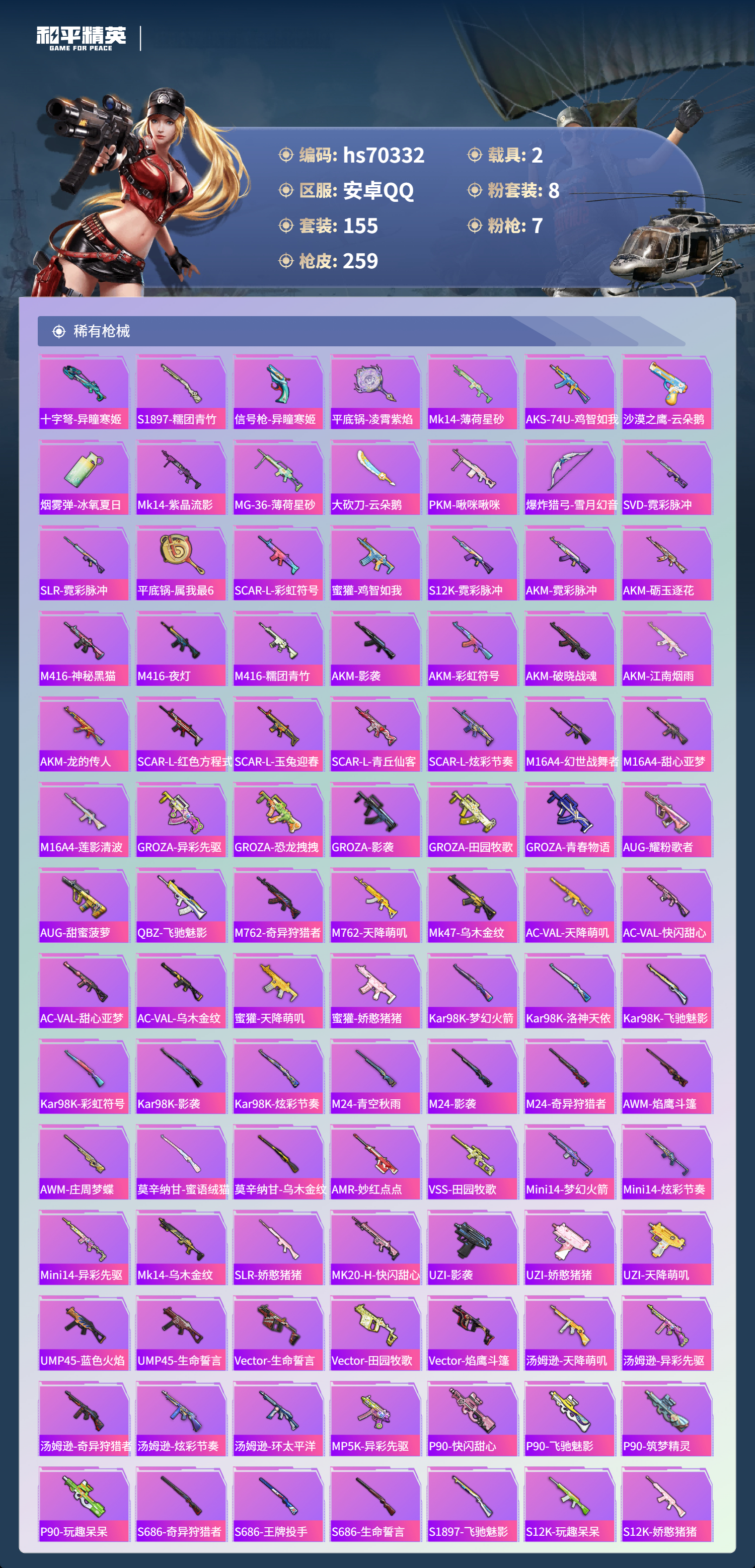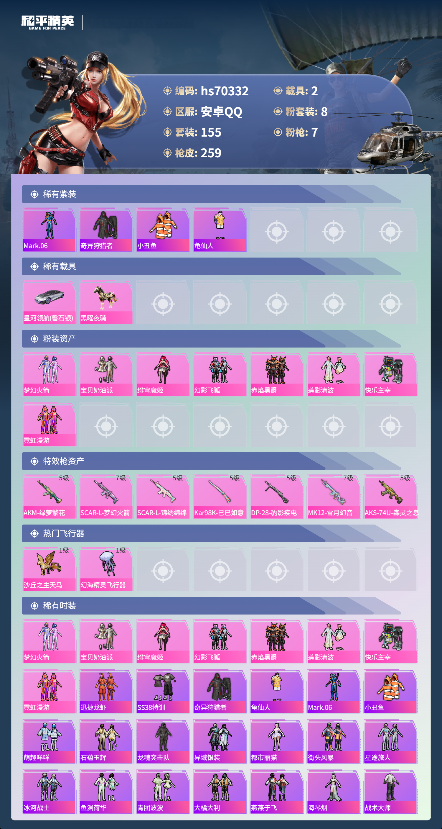 hs70332 安卓手Q-5王牌印记-8粉装-7特效枪-2载具-81894热力值-155套装-259枪皮
