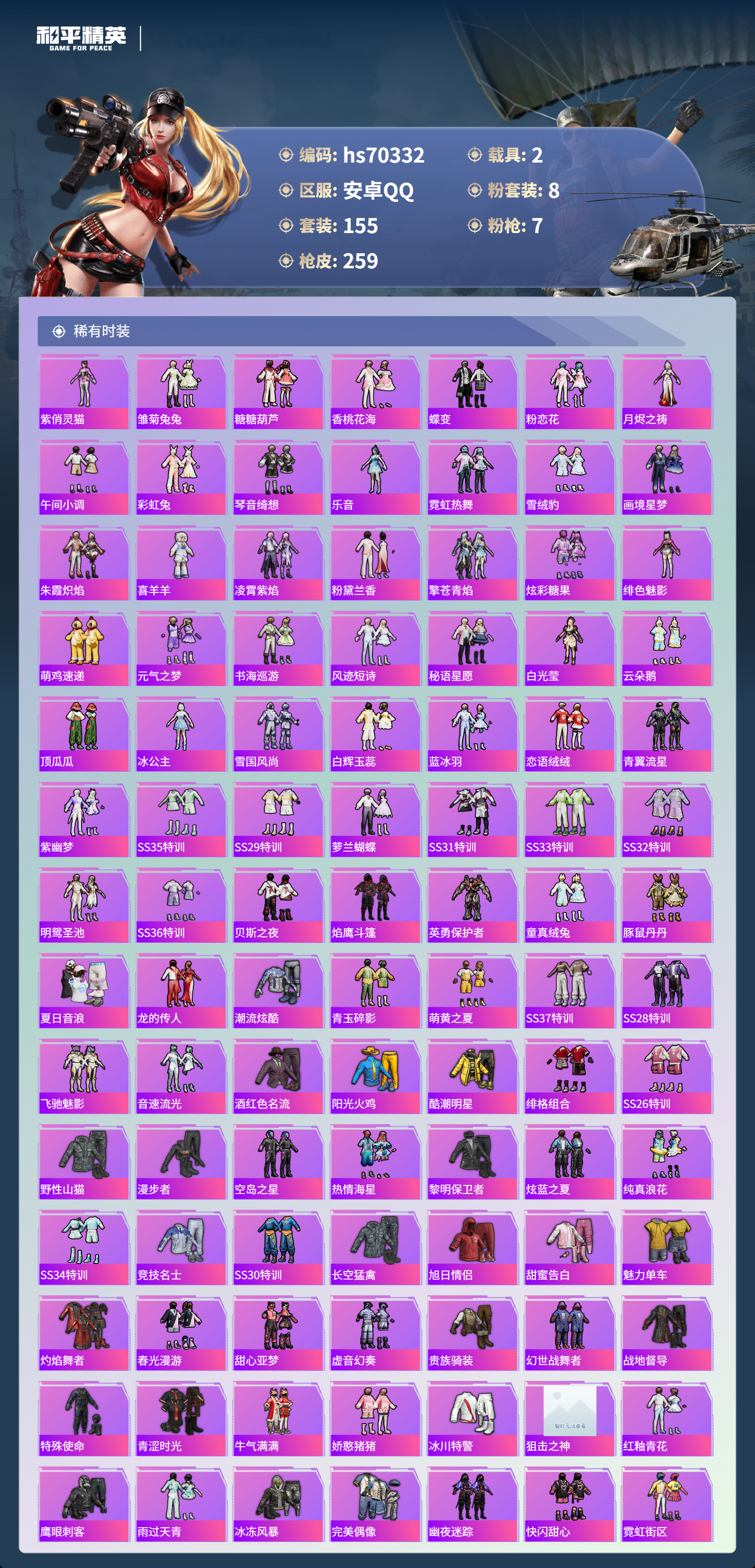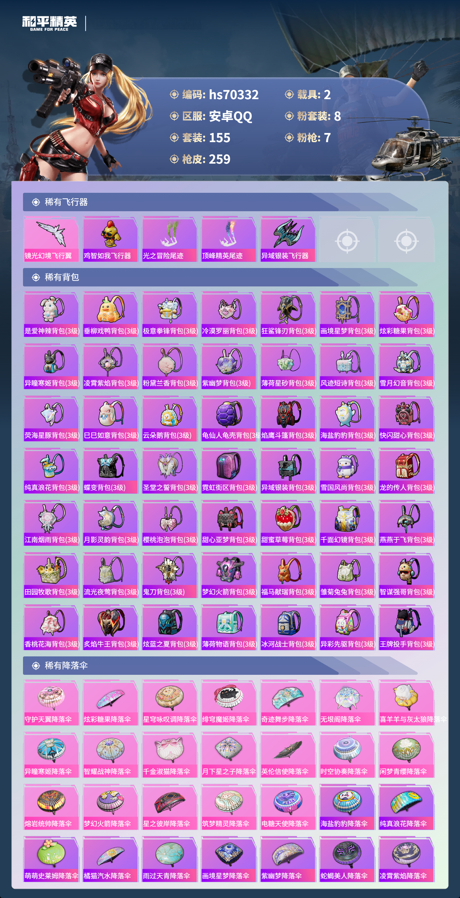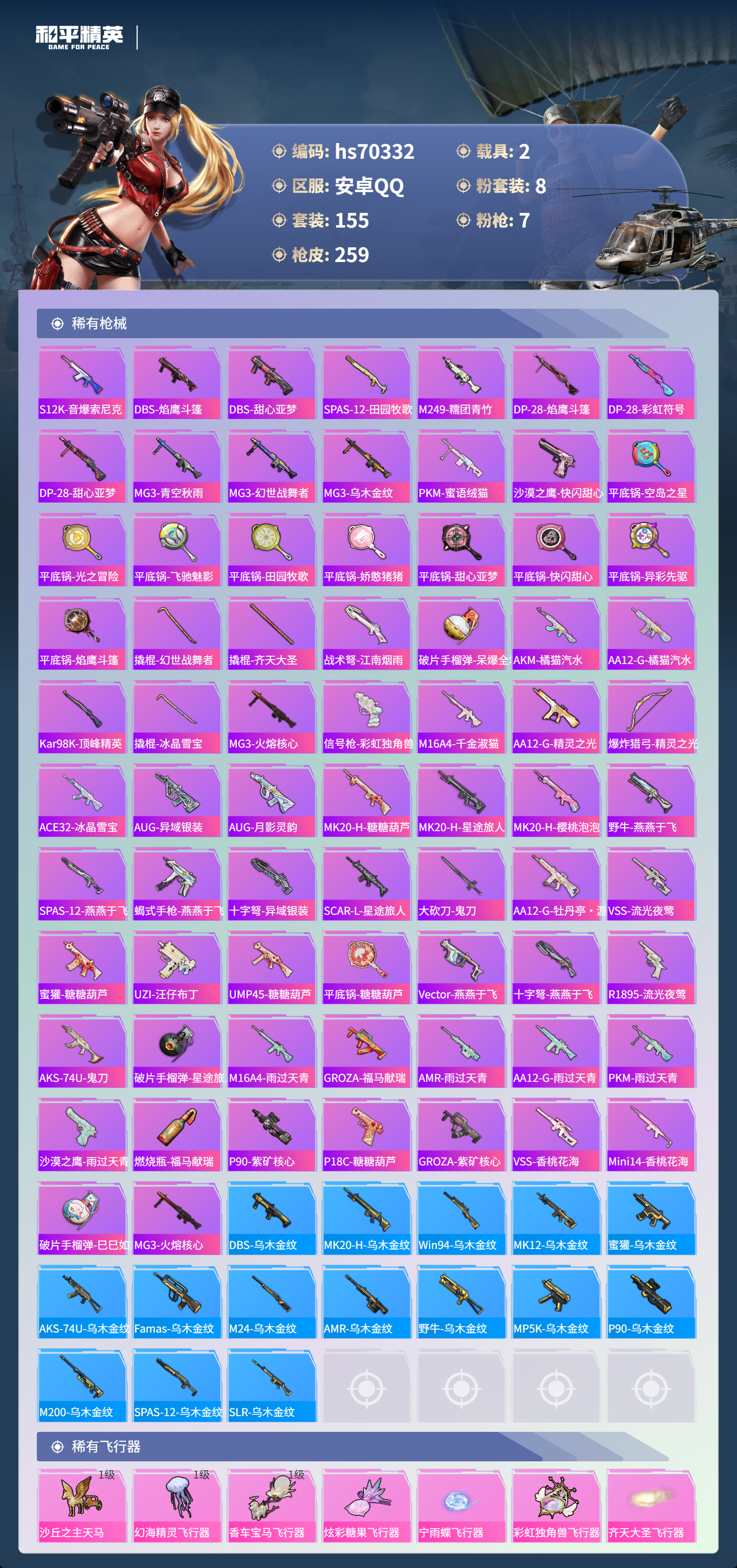 hs70332 安卓手Q-5王牌印记-8粉装-7特效枪-2载具-81894热力值-155套装-259枪皮