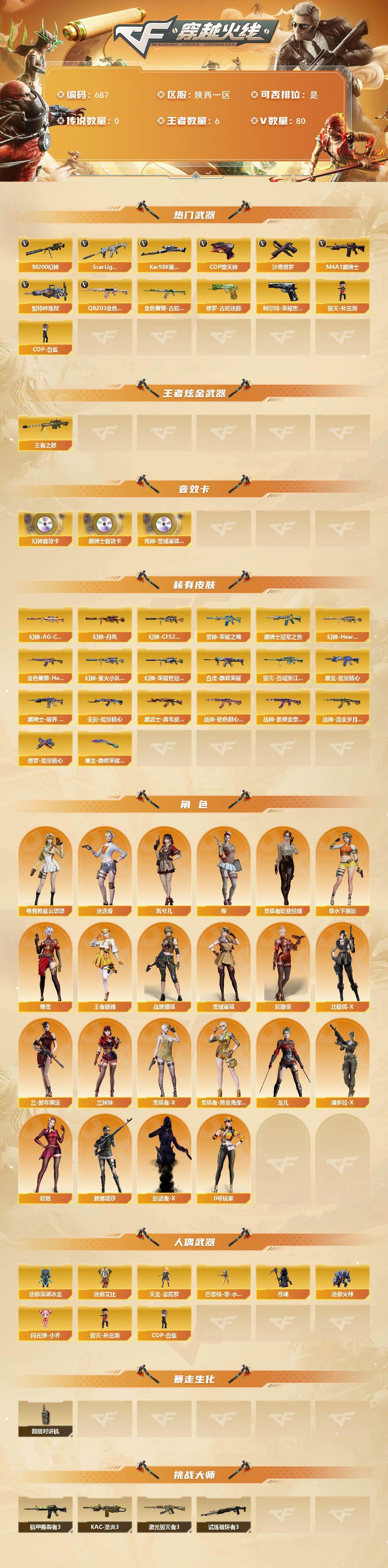 陕西一区-80V-6王者-0炫金【热门武器】:QBZ03-金色蔷薇,Scar Light-白虎,M200-幻神,柯尔特-荣耀世冠白鲨2023,金色蔷薇-古蛇迷踪,修罗-古蛇迷踪,Kar98K-星神,M4A1-黑骑士,加特林-炼狱*2,毁灭-孙三炮,COP-白鲨,COP-堕天神,沙鹰-修罗*3【王者炫金武器】:王者之怒*2【音效卡】:M200-幻神音效卡,M4A1-黑骑士音效卡,死神-雪域霜狐-怀旧音效卡【皮肤】:幻神-丹凤,幻神-CFS2022,幻神-Heartshot 皮肤,幻神-星火小队签名