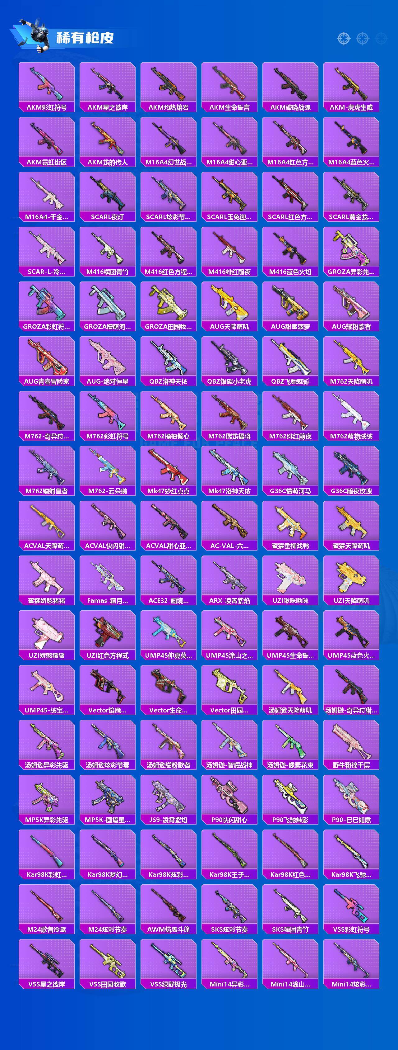【粉色枪皮等级】:SCAR-L-锦绣绵绵(五级),M416-电玩时刻(五级),M762-青锋波束(五级),A