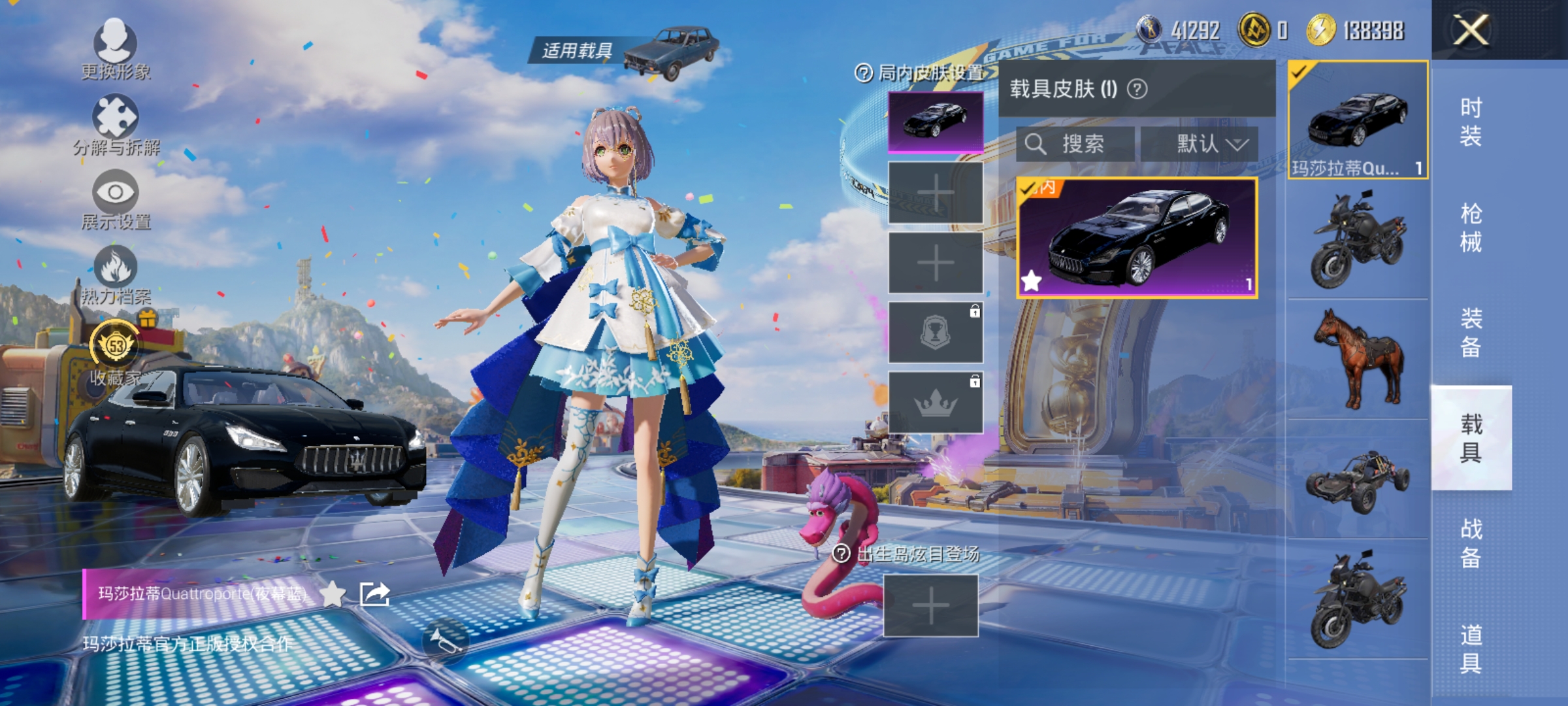 可二次【洛天依小丑鱼5粉装5特效枪1载具 秒换绑不用等】 安卓Q区-47895热力值-110套装-143枪皮 【1载具】 玛莎拉蒂Quattroporte(夜幕蓝)【5粉装】 洛天依 玩偶服-猪猪侠 闲梦青缨 炙焰红王 飒粉甜心【5特效枪】 Mk14-闲梦青缨(7级) AMR-炫光之旅(7级) M249-彩虹甜喵(7级) AKM-绿萝繁花(5级) Kar98K-巳巳如意(4级)