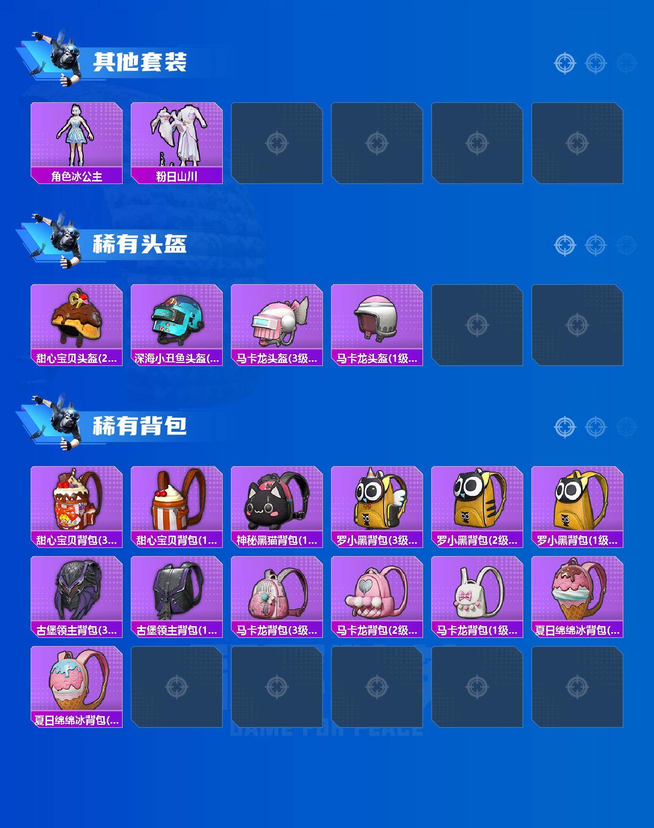 【热门品类】:粉装-童趣迷兔,粉装-缤纷油彩,套装-浪漫天命,套装-都市猎人,套装-小丑鱼,套装-奇异狩猎者,角色-忠真马岱,套装-龟仙人,套装-暗影哥特,套装-粉红小猪,大砍刀-青龙偃月刀,撬棍-龙胆亮银枪