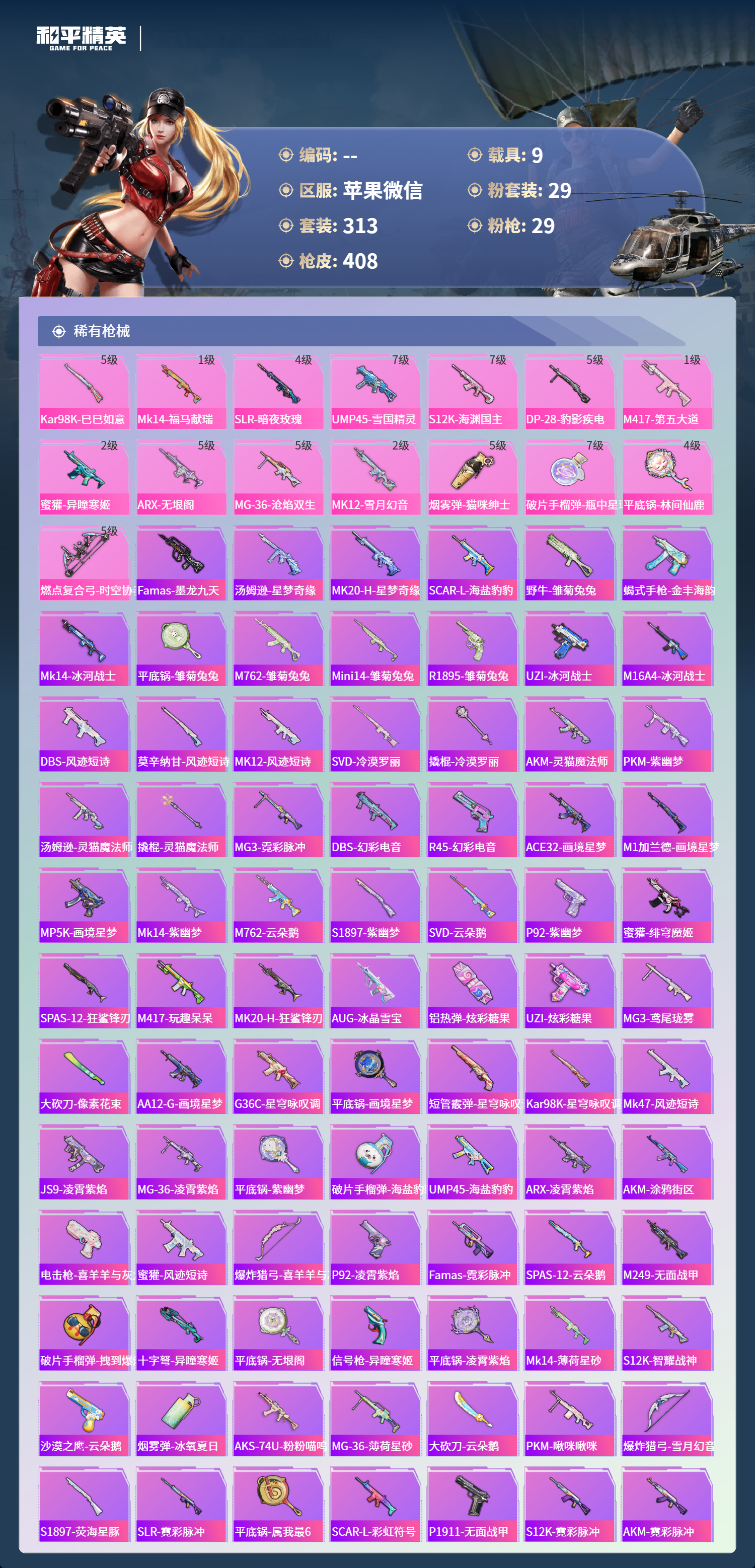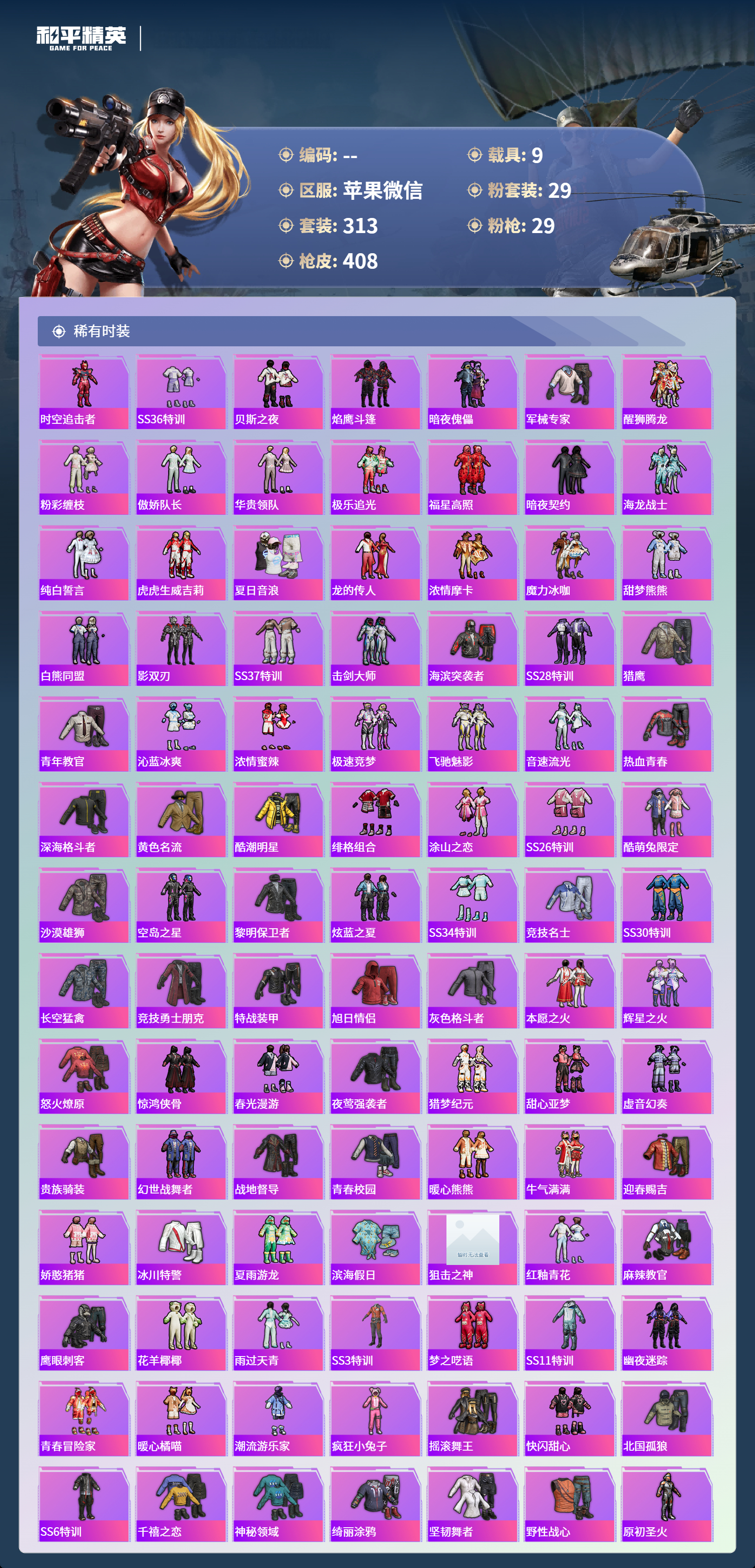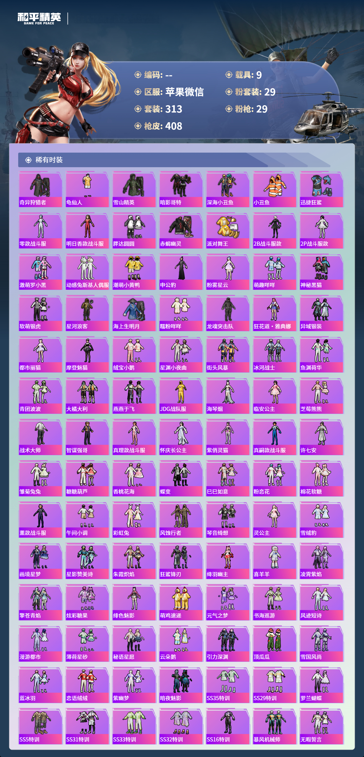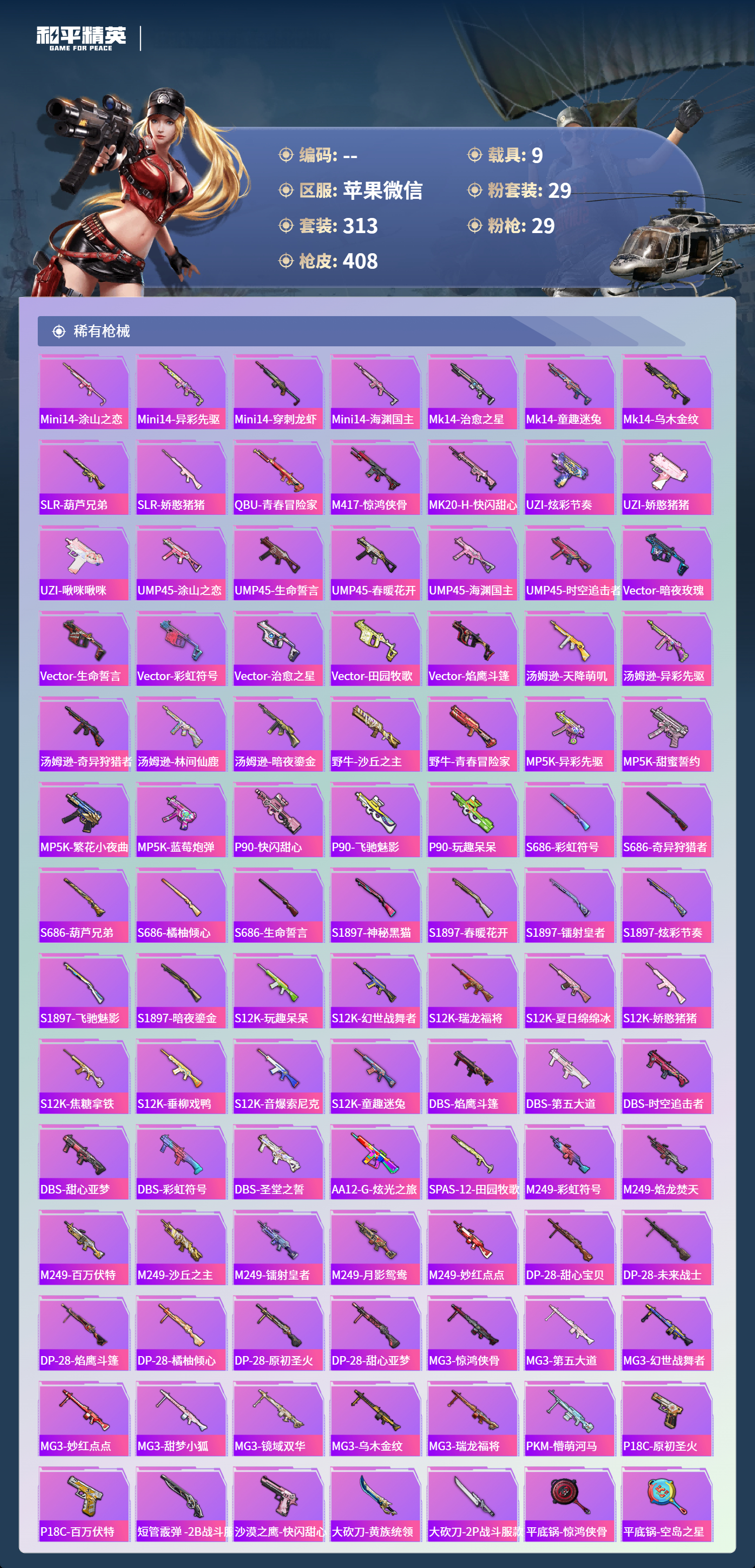 hs70789苹果微信-27王牌印记-1红装-29粉装-29特效枪-9载具-热力值-313套装-408枪皮-12卓越印记-9传奇印记