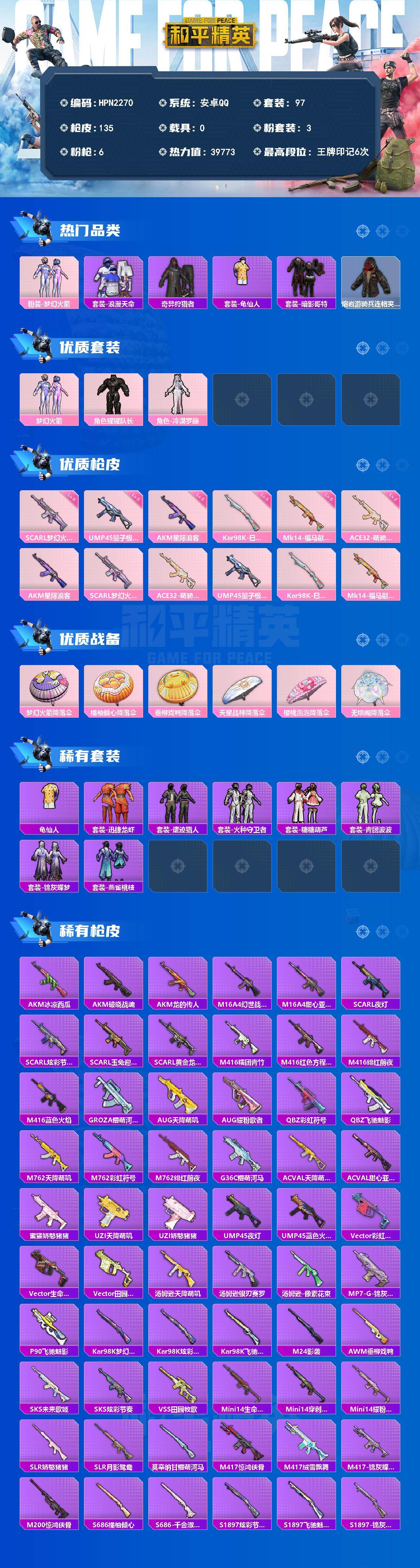 安卓 手Q-3粉装-6特效枪-0载具-0粉色飞行器-39773热力值-6王牌印记-97套装-135枪皮