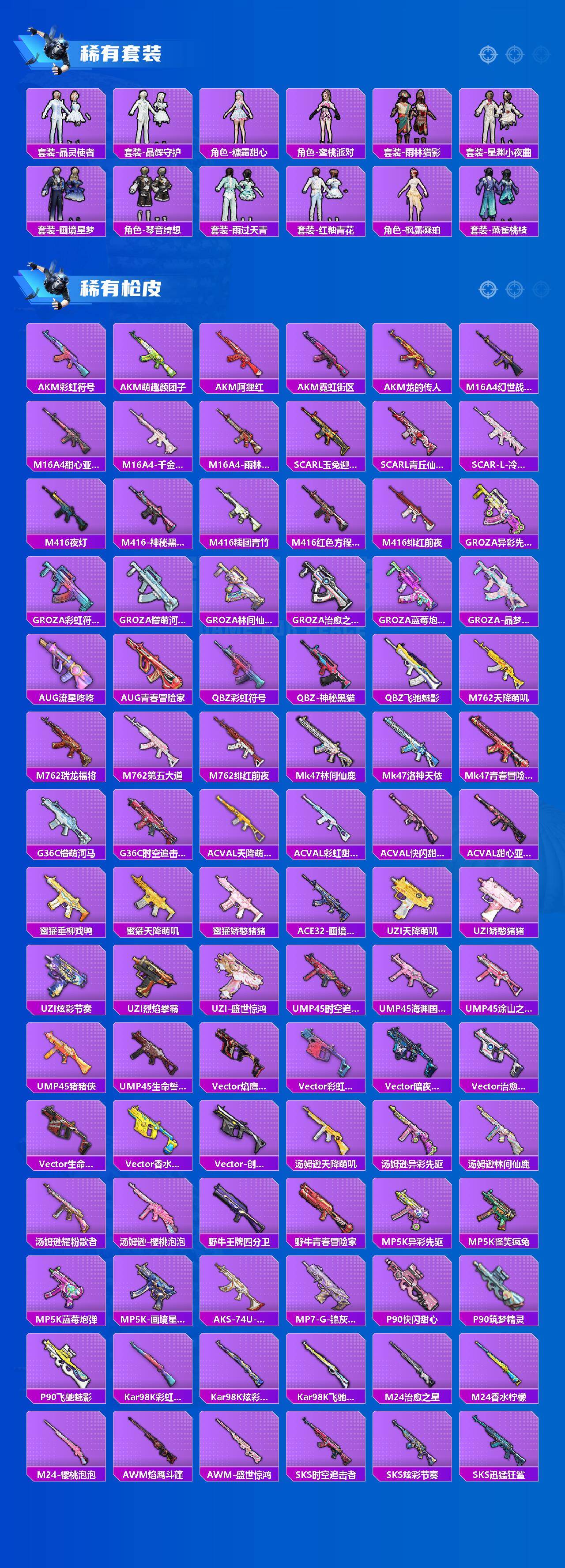 【粉色套装】:粉装-梦幻火箭,粉装-香水柠檬,粉装-烈焰拳霸,粉装-彩虹鹿灵,粉装-山涧鹿灵,粉装-花影阑珊,粉装-炙焰牛王,粉装-第五大道,粉装-莲影清波,粉装-蜜语绒猫,角色-美雪,角色-晶梦幻蝶,角色-樱桃泡泡,粉装-幻彩电音