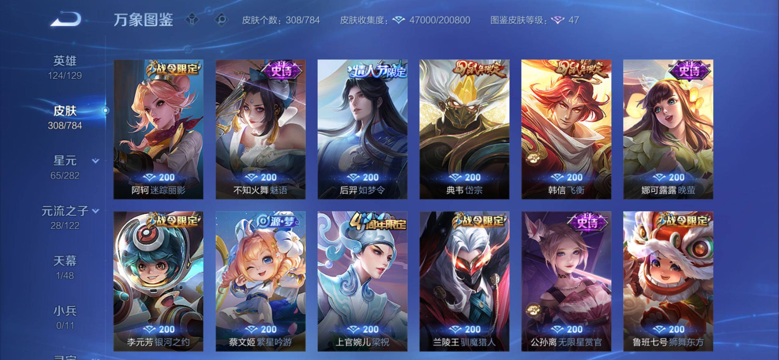 /可换绑【高性价比·对抗路44段·万战金标苍·三典藏·武圣·太华·白虎志·永曜之星·默契交锋·御风骁将·白晶晶·神威·如梦令·岱宗·飞衡·青龙志·冰霜恋舞曲·蜜橘之夏·青春决赛季·无二次】 3按键 2星传说,23王者印记,满级铭文,无二次苹果Q-V9-308皮肤-3典藏皮肤-21传说-89史诗【英雄全皮】:猪八戒全皮【荣耀典藏】:孙尚香杀手不太冷,李白鸣剑曳影,诸葛亮