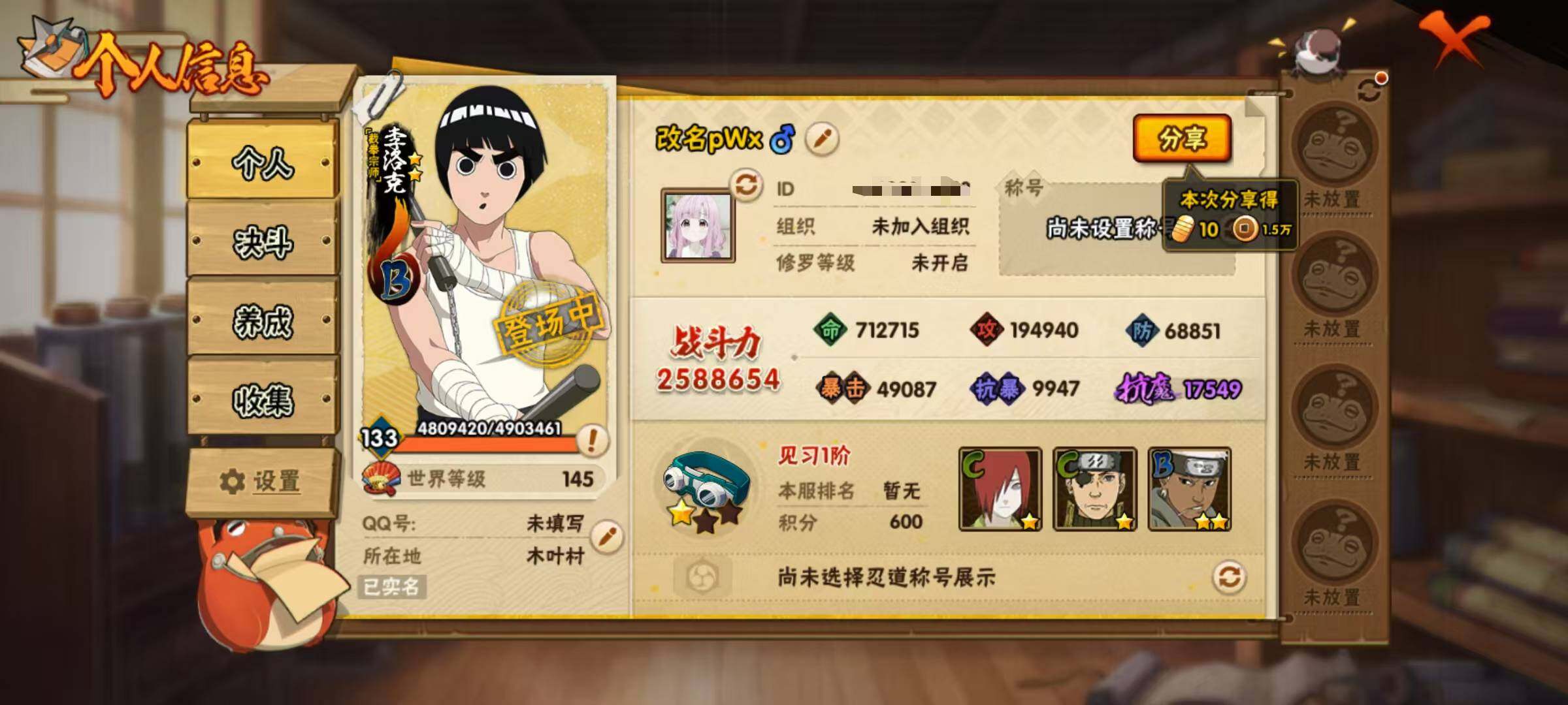 VIP等级V6/战力257W/S忍数量4/A忍数量10/舞之豪