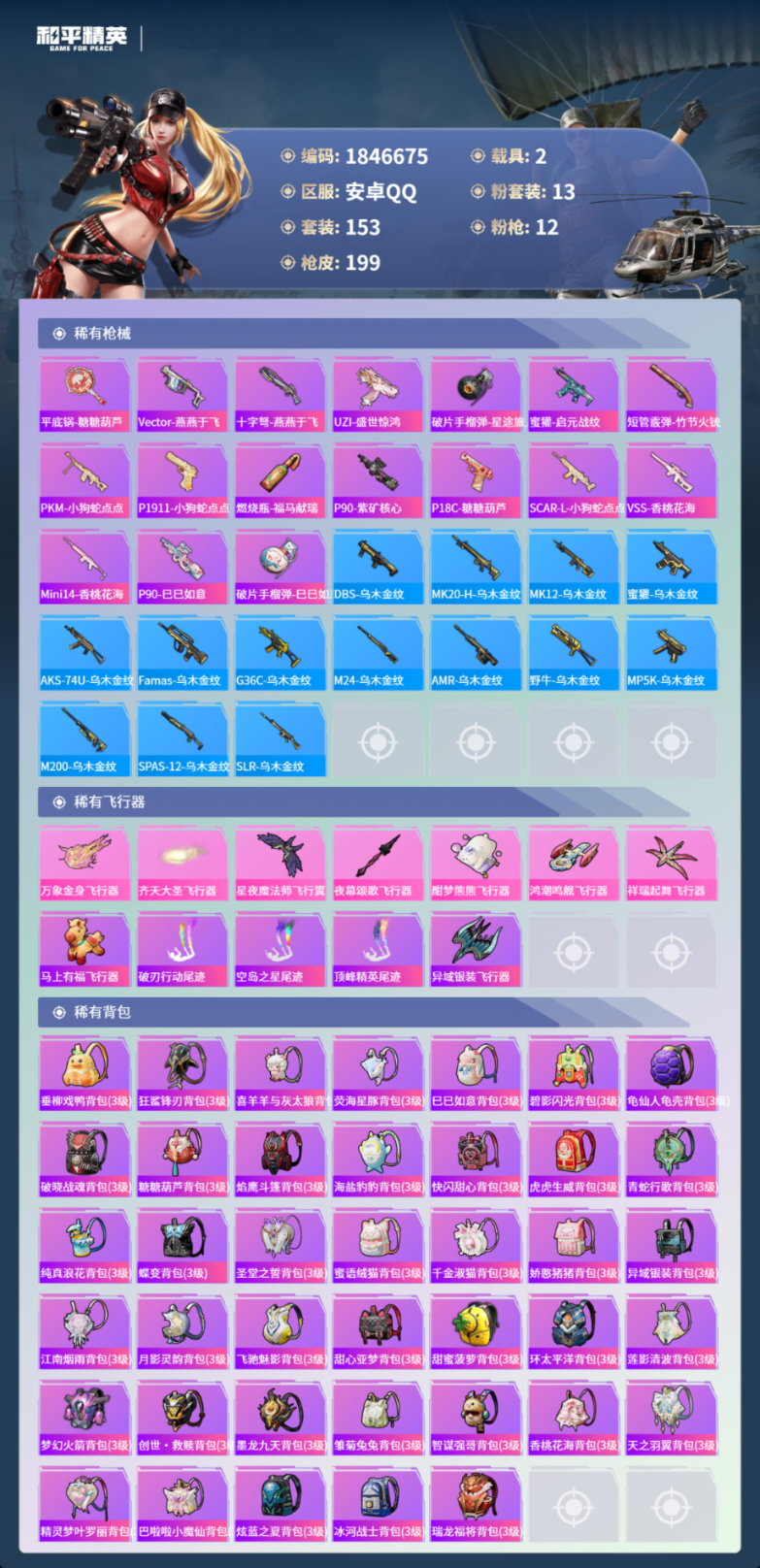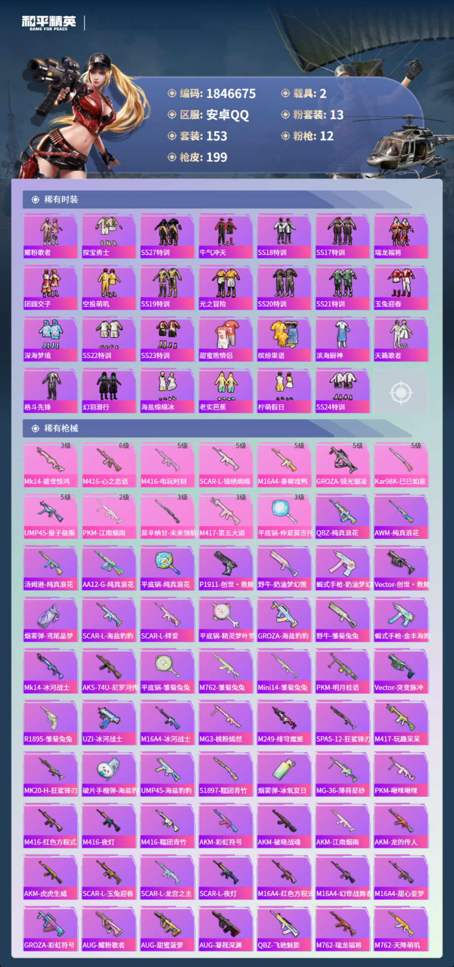 安卓手Q7王牌印记-13粉装-12特效枪-2载具-72800热力值-153套装-199枪皮-1卓越印记