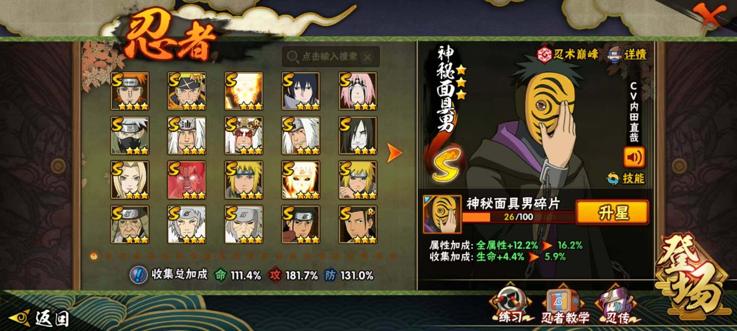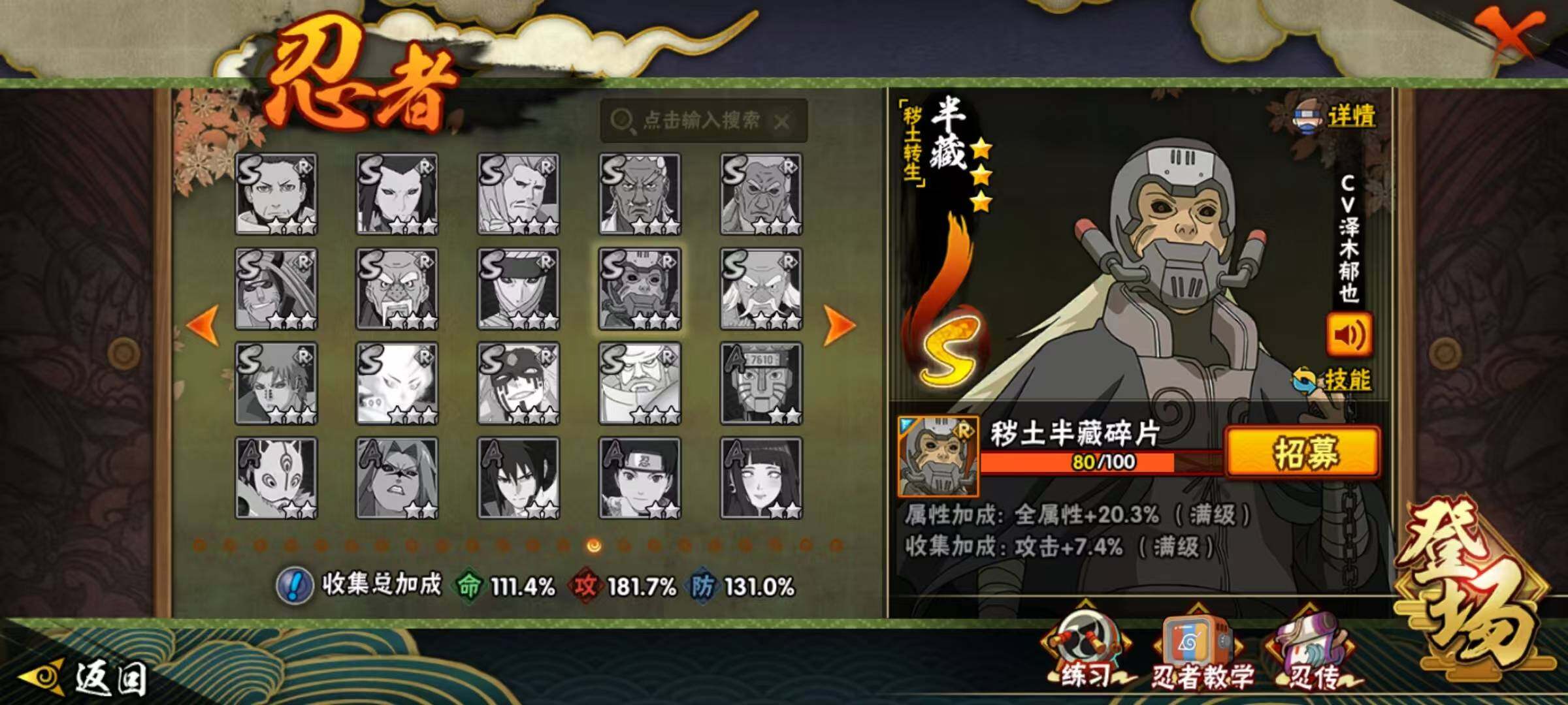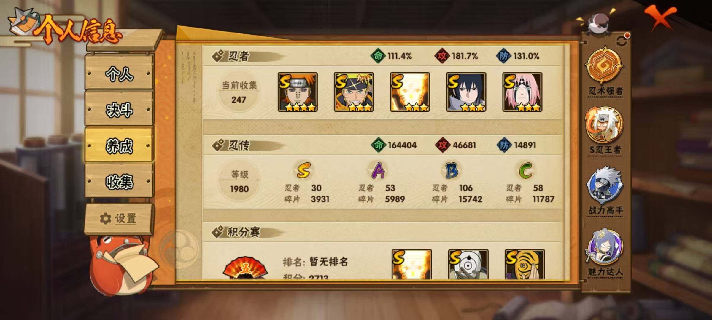 VIP等级V11/战力1123W/S忍数量30/A忍数量53/