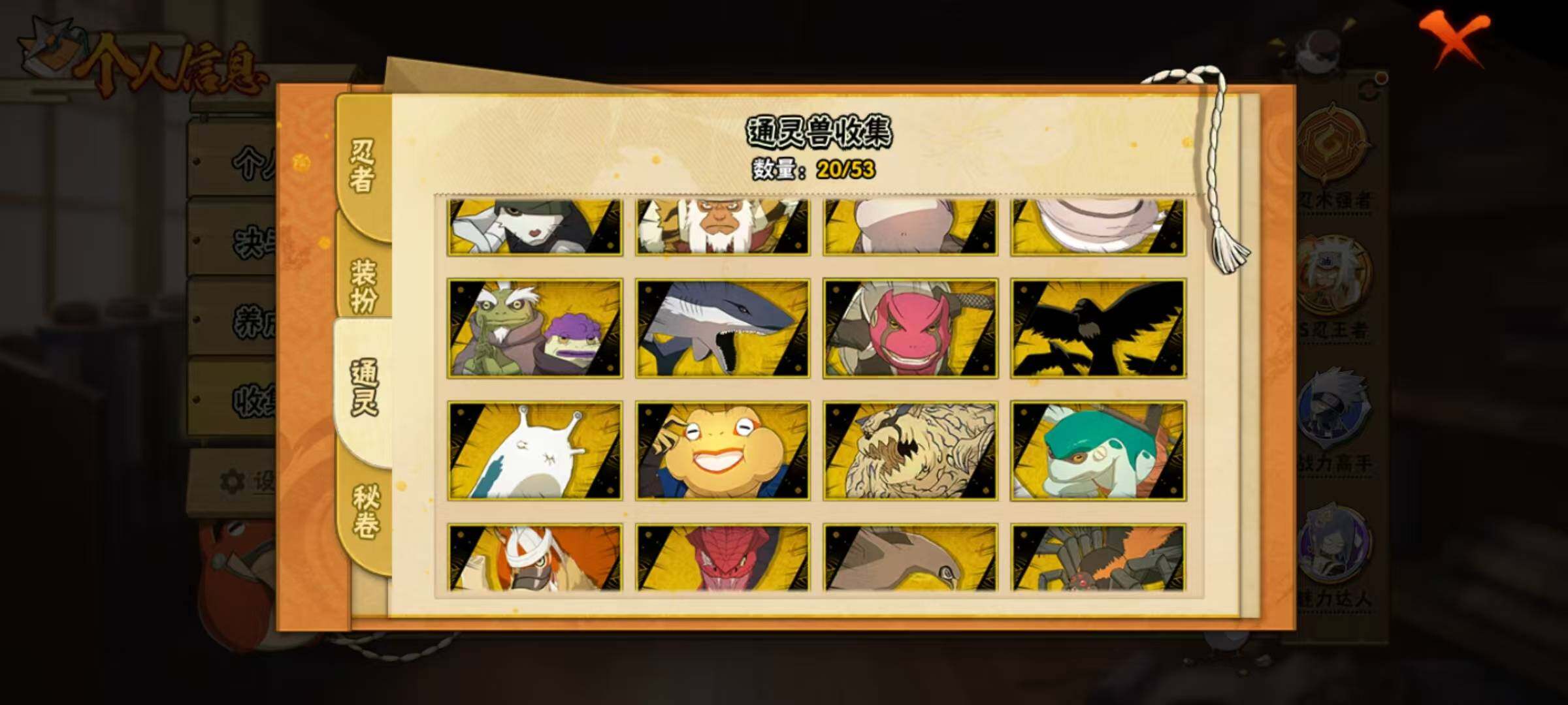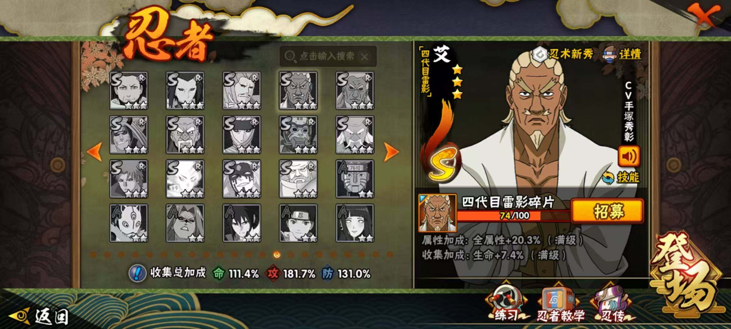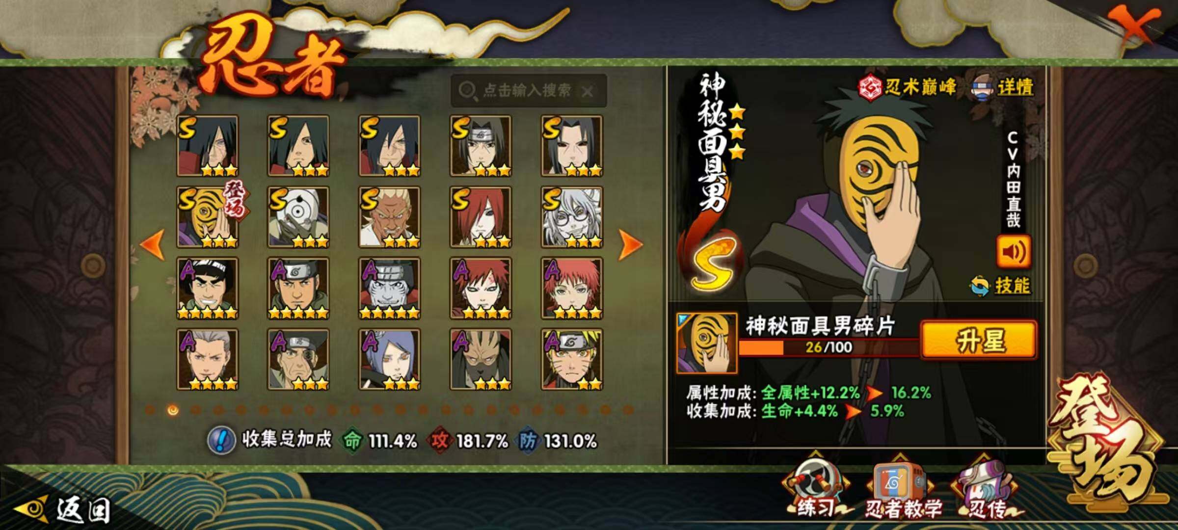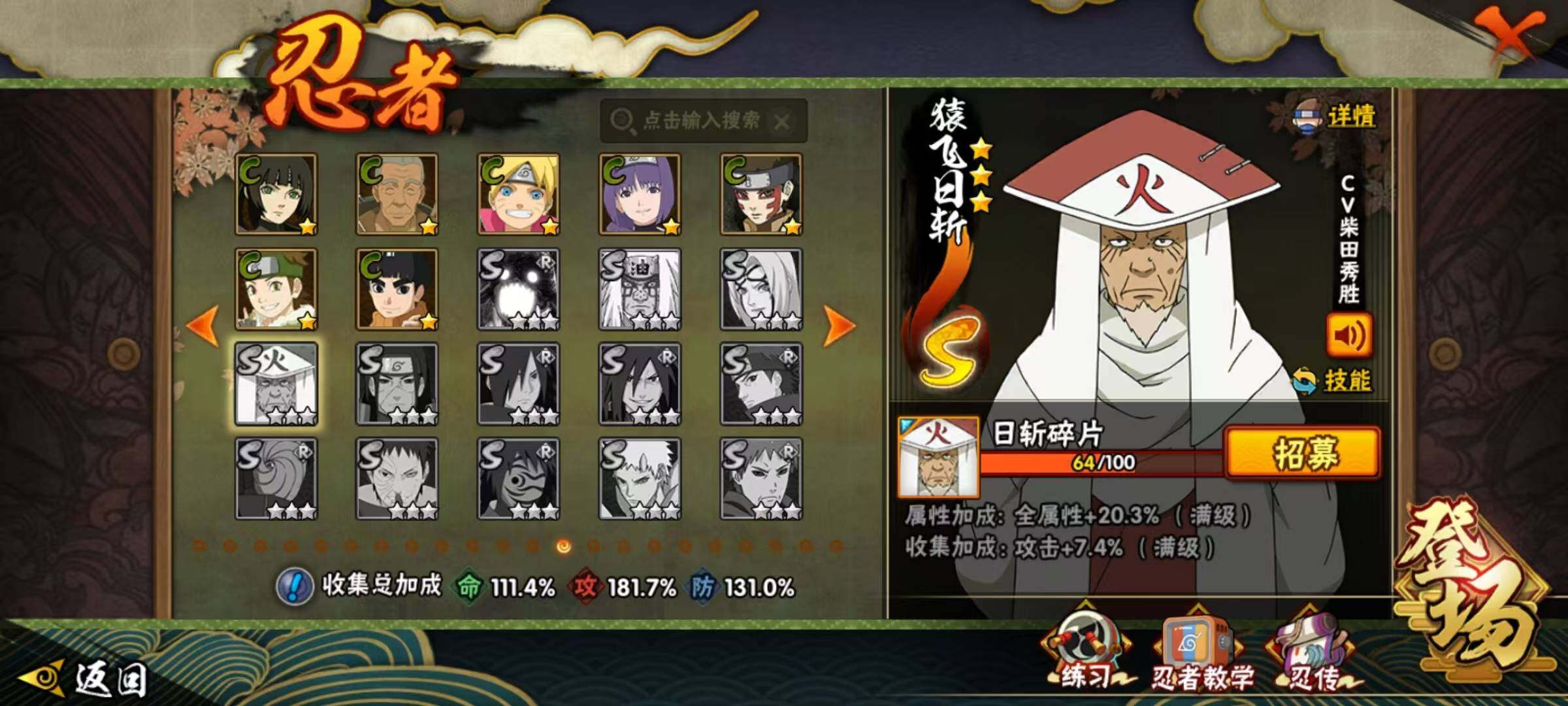 VIP等级V11/战力1123W/S忍数量30/A忍数量53/