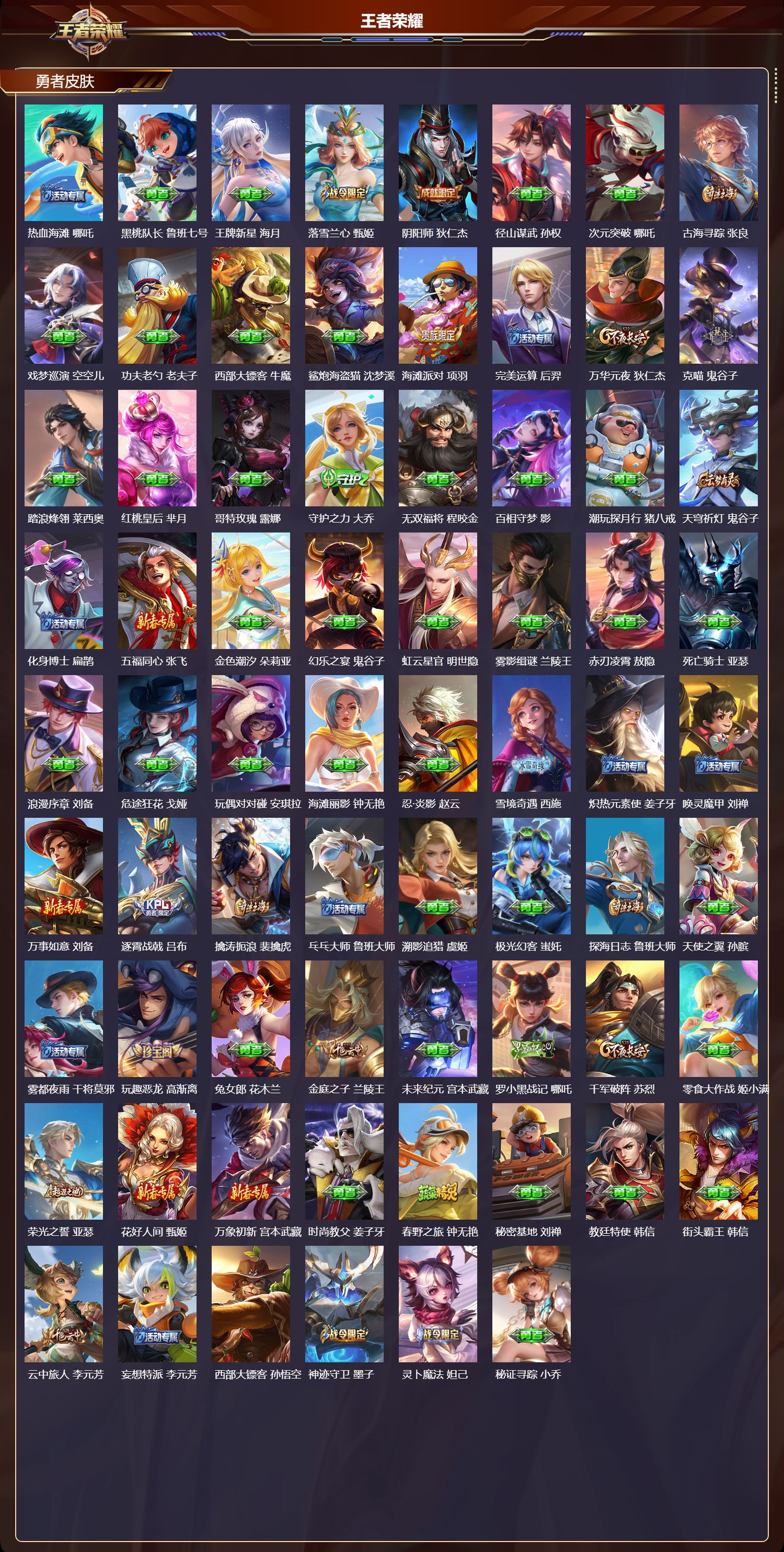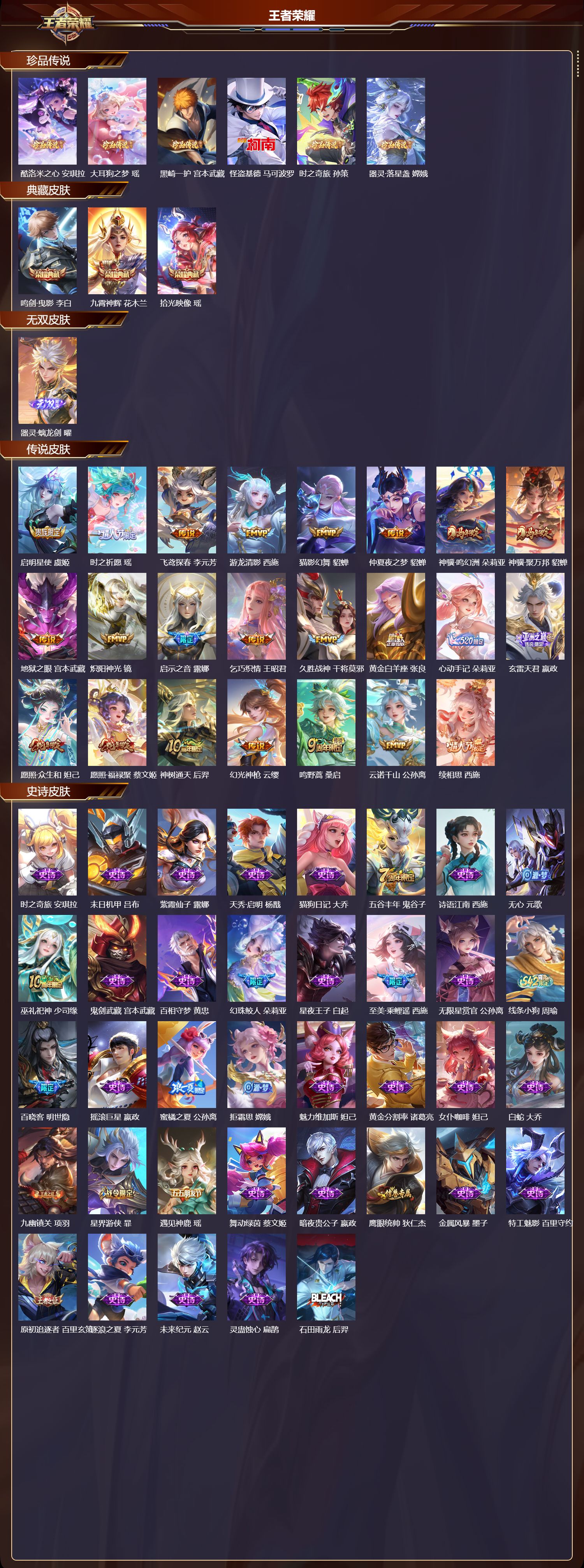 安卓QQ/永恒钻石/311皮肤/128英雄/3典藏/0珍品无双/1无双/6珍品传说/23传说/90史诗/8稀有英雄【6 珍品传说】酷洛米之心 安琪拉,大耳狗之梦 瑶,黑崎一护 宫本武藏,怪盗基德 马可波罗,时之奇旅 孙策,器灵·落星盏 嫦娥,【3 典藏皮肤】鸣剑·曳影 李白,九霄神辉 花木兰,拾光映像 瑶,【1 无双皮肤】器灵·螭龙剑 曜,【23 传说皮肤】启明星使 虞姬,时之祈愿 瑶,飞鸢探春