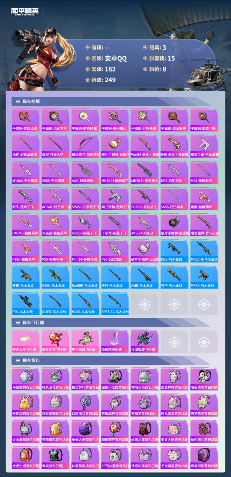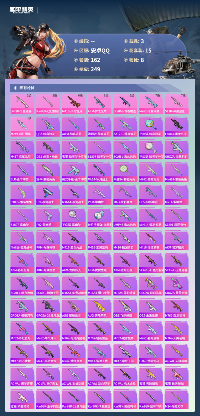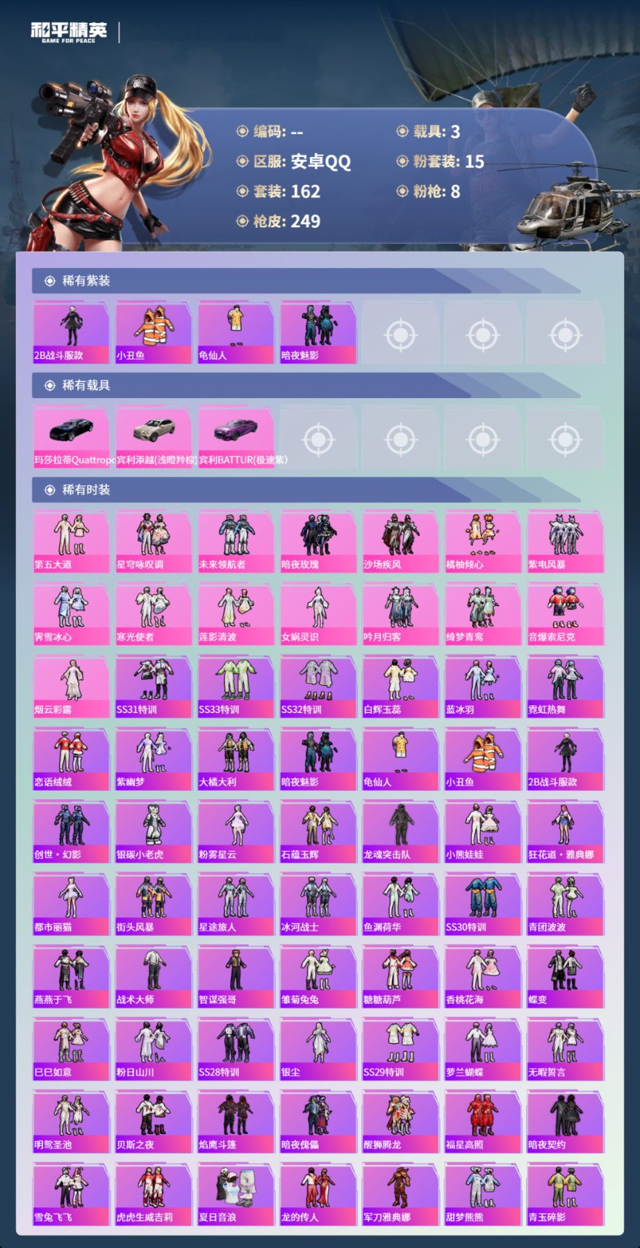 安卓手Q11王牌印记-15粉装-8特效枪-3载具-86628热力值-174套装-258枪皮