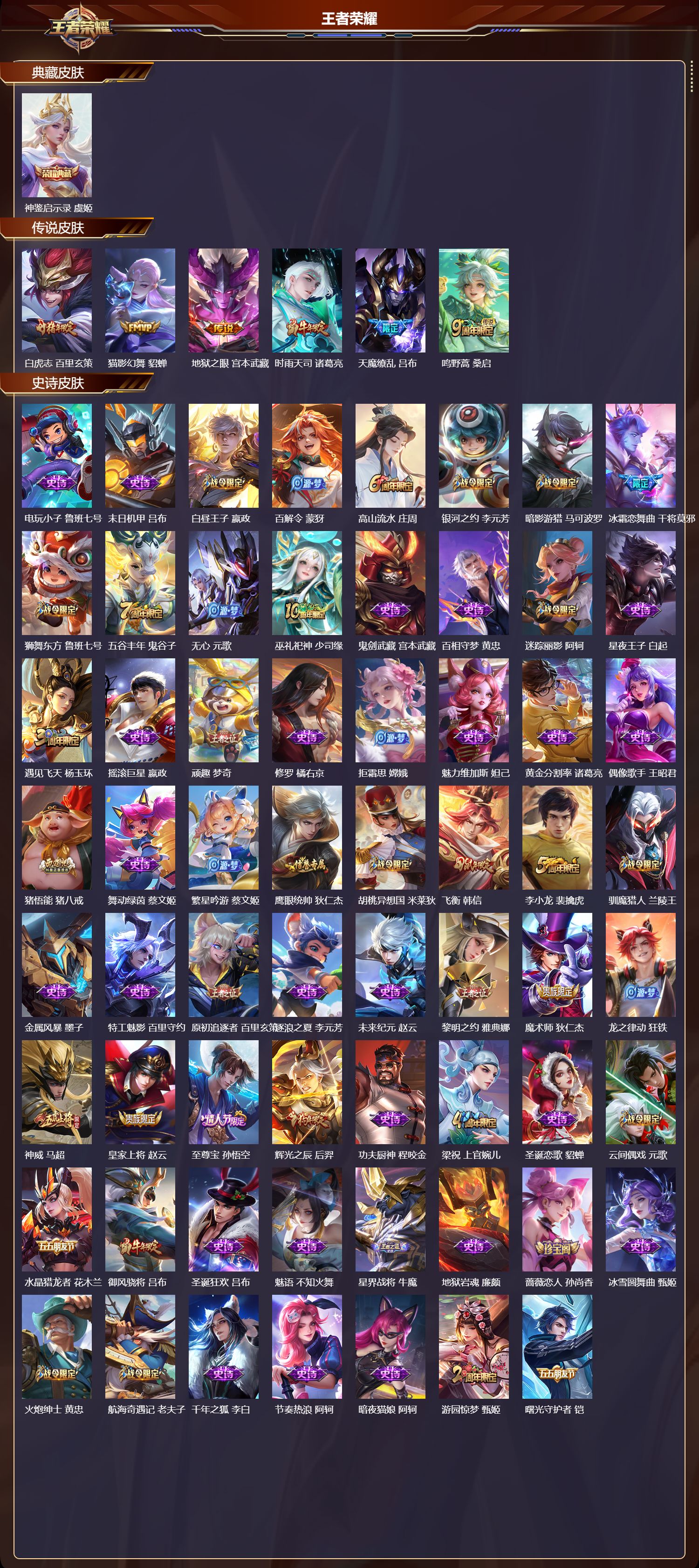 安卓QQ/永恒钻石/264皮肤/126英雄/1典藏/0珍品无双/0无双/0珍品传说/6传说/77史诗/7稀有英雄【1 典藏皮肤】神鉴启示录 虞姬,【6 传说皮肤】白虎志 百里玄策,猫影幻舞 貂蝉,地狱之眼 宫本武藏,时雨天司 诸葛亮,天魔缭乱 吕布,鸣野蒿 桑启,【77 史诗皮肤】电玩小子 鲁班七号,末日机甲 吕布,白昼王子 嬴政,百解令 蒙犽,高山流水 庄周,银河之约 李元芳,暗影游猎 马可波罗