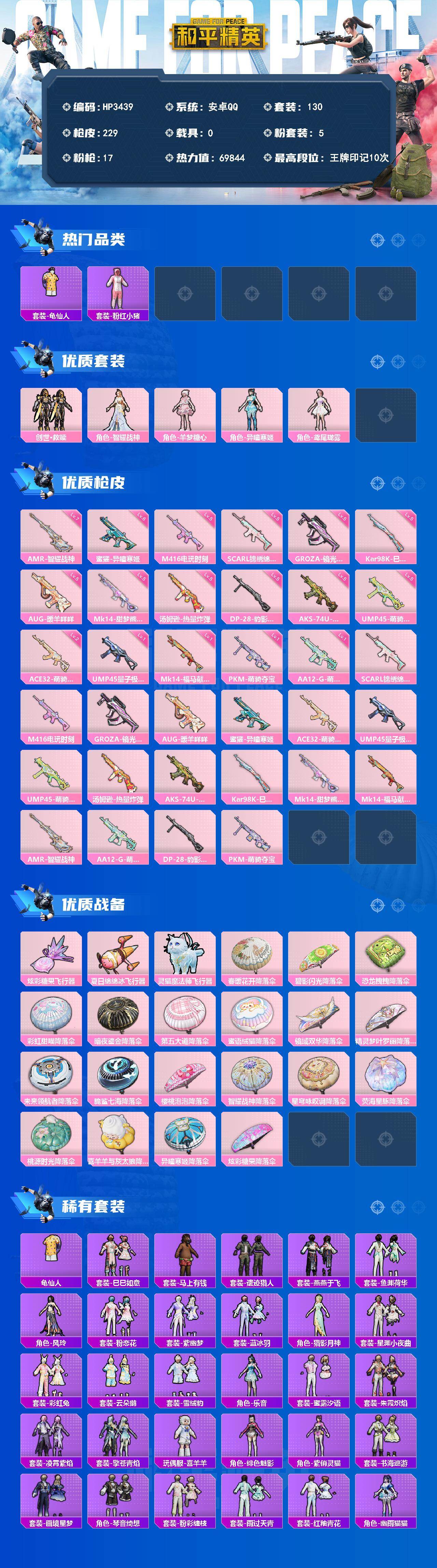 【HP3439】130套装/枪械17/装备298/战备144/王牌印记10/热力值69844/五级SCAR-L-锦绣绵绵/五级M416-电玩时刻/五级GROZA-镜光银凌/五级AUG-暖羊咩咩/六级蜜獾-异瞳寒姬/二级ACE32-萌骑漫游/一级UMP45-量子极限/五级UMP45-萌骑冒险/五级汤姆逊-热量炸弹/五级AKS-74U-森灵之息/五级Kar98K-巳巳如意/五级Mk14-甜梦熊击/一级Mk14-福马献瑞/七级AMR-智耀战神/一级AA12-G-萌骑幻想/五级DP-28-豹影疾电/一级