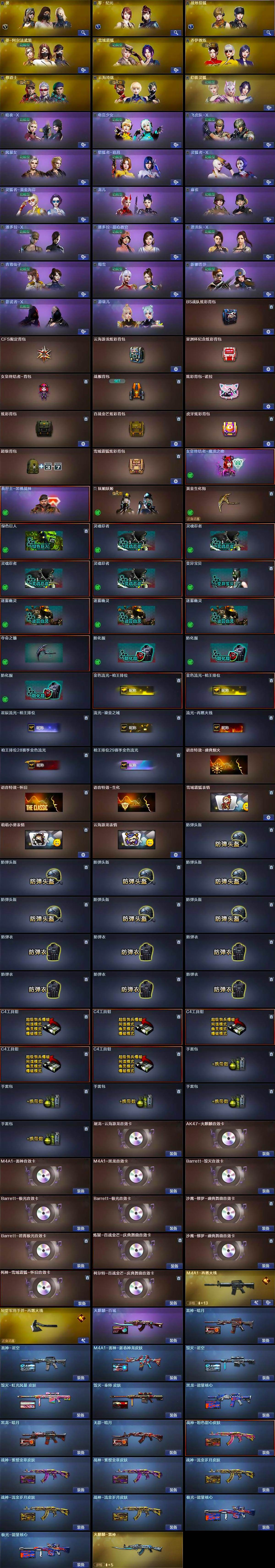【音效卡】:屠龙-云海游龙音效卡,AK47-火麒麟音效卡,M4A1-雷神音效卡,M4A1-黑龙音效卡,Barrett-毁灭音效卡,Barrett-极光音效卡*2,沙鹰-修罗-盛典舞曲音效卡*2,Barrett-碧霄极光音效卡,炼狱-百战金芒-庆典舞曲音效卡,死神-雪域霜狐-怀旧音效卡,柯尔特-百战金芒-庆典舞曲音效卡