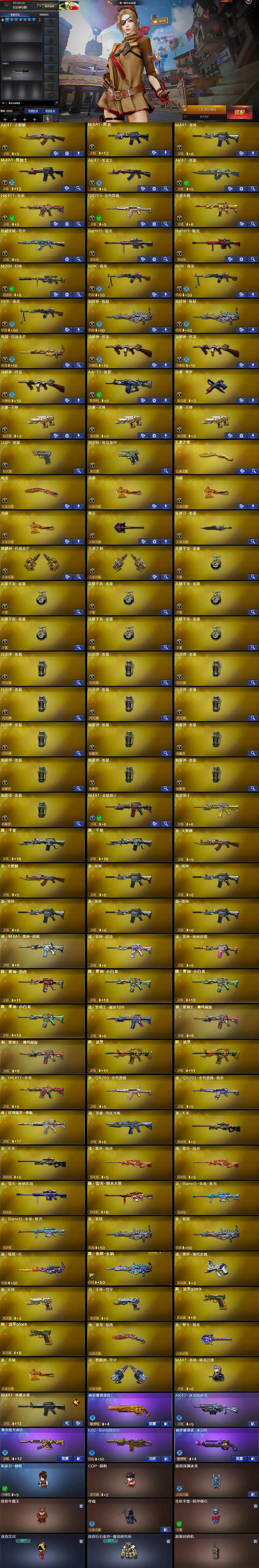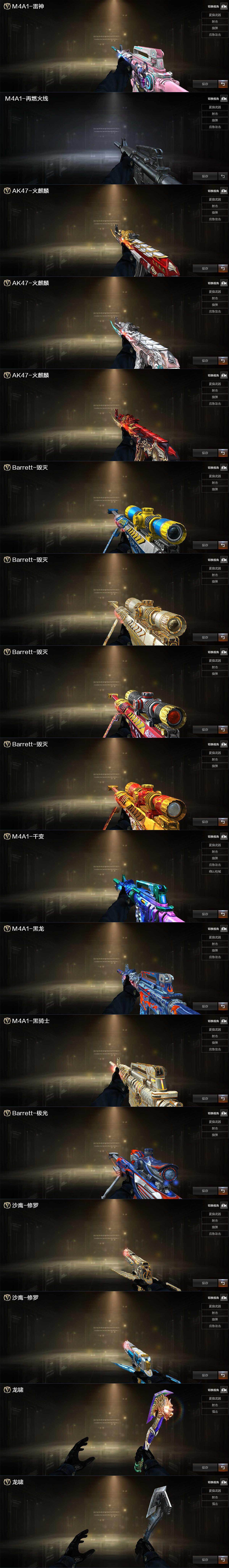 【热门武器】:QBZ03-金色蔷薇,HK417-朱雀,M200-幻神,M4A1-黑骑士,汤姆逊-烈龙*3,RPK-盘龙*3,加特林-炼狱*2,斯泰尔-蝴蝶,USP-雷暴,沙鹰-修罗,金刚伞