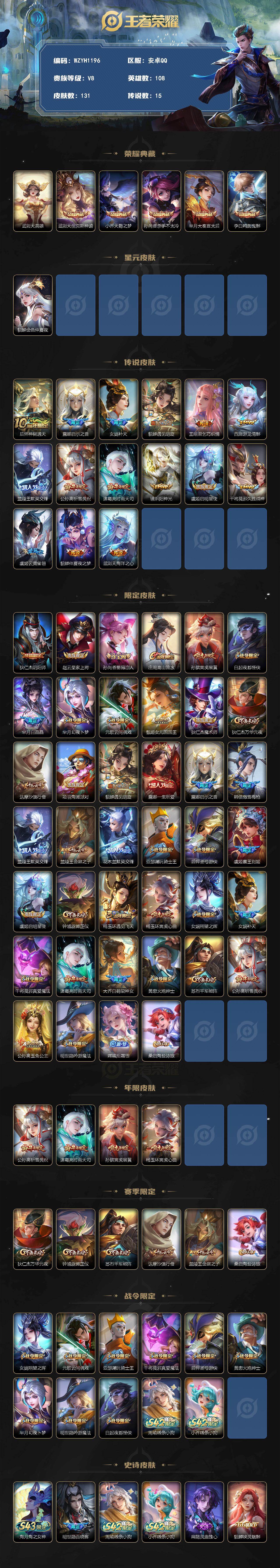 安卓Q-V8-永恒钻石II段位-108英雄-131皮肤-5典藏皮肤-1典藏英雄-15传说-51史诗