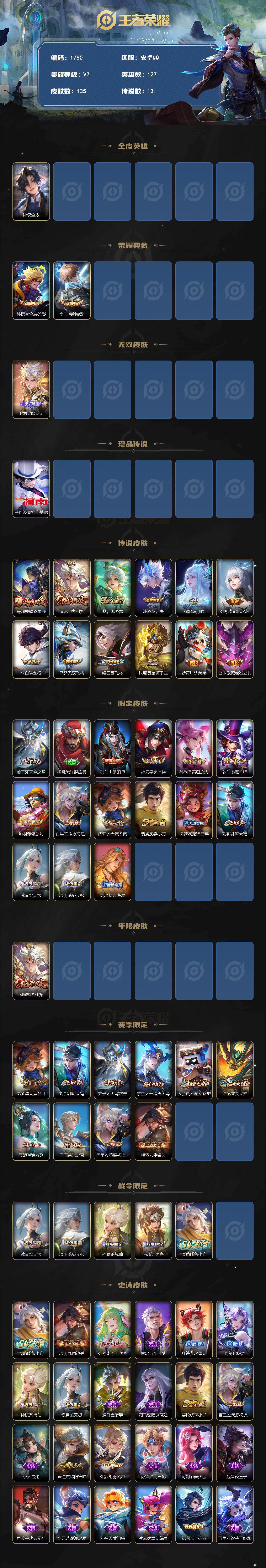 2827867 王者荣耀账号 安卓Q-V7-至尊星耀V段位-127英雄-135皮肤-2典藏皮肤-1无双-1珍品传说-12传说-39史诗