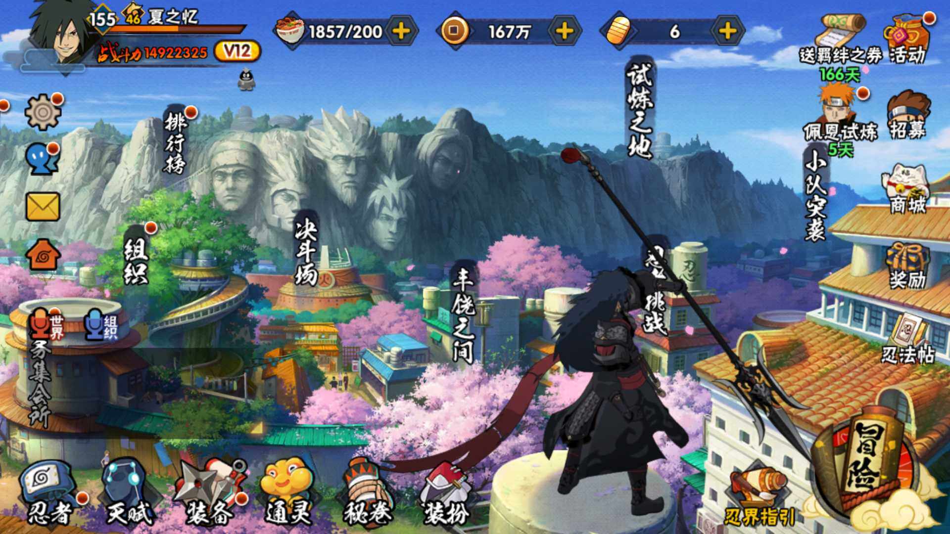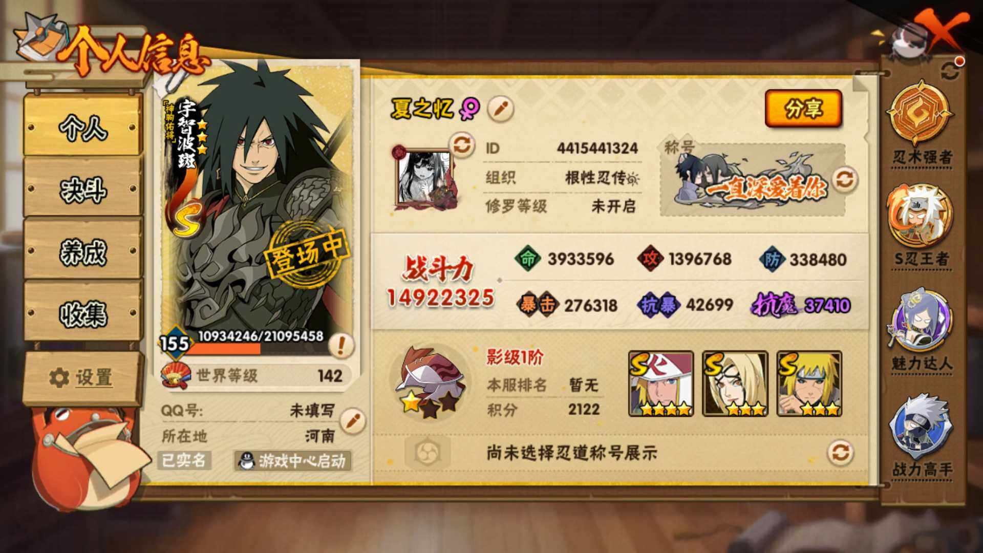 (可免费转苹果)v12 38S 54A 1492w战力 创立柱间80片 博人传桃式91片 鬼灯幻月56片 忍战大野木80片 热门A忍:新春限定宇智波鼬 侠隐大野木 疾风传咒印宇智波佐助 小南新春限定 漂泊小南 神秘面具男忍者之路 1个主场景:博人传 已购忍法帖 AA1100