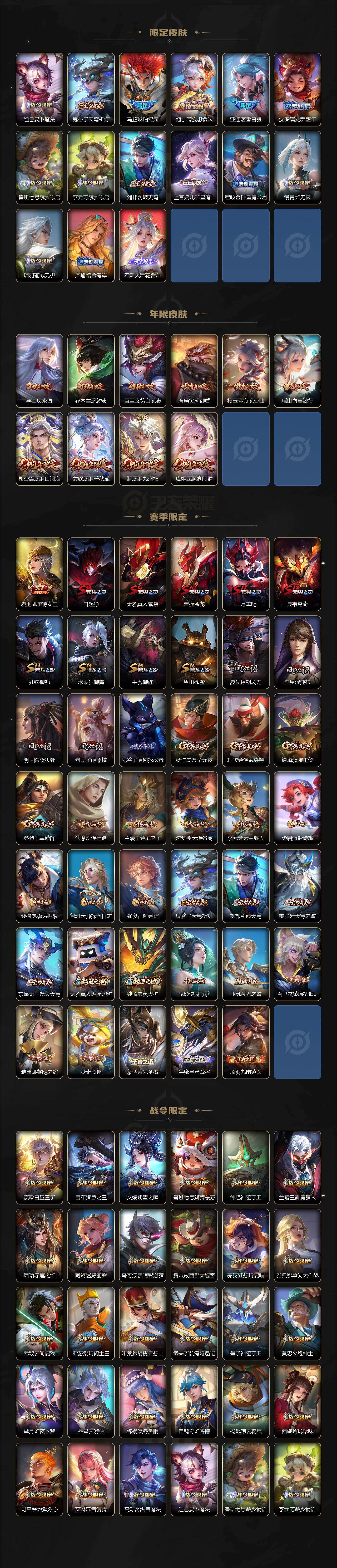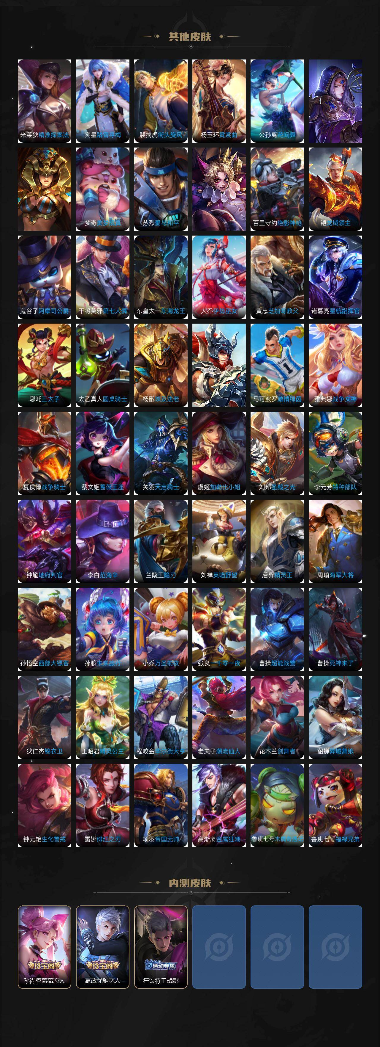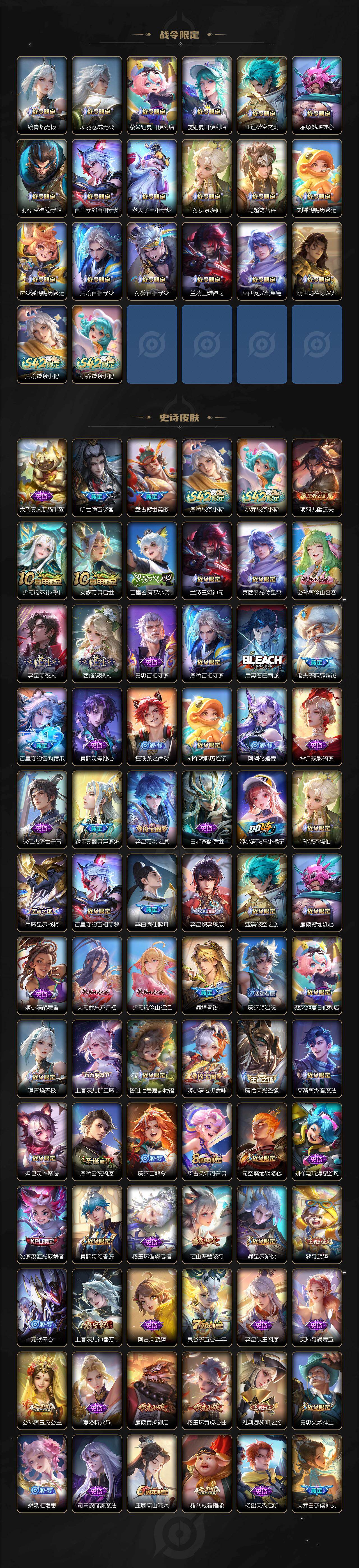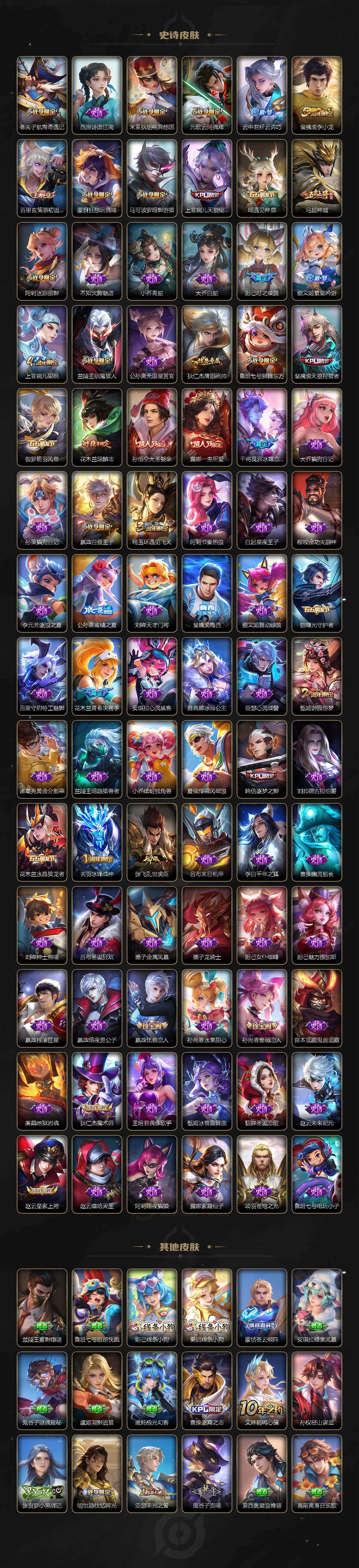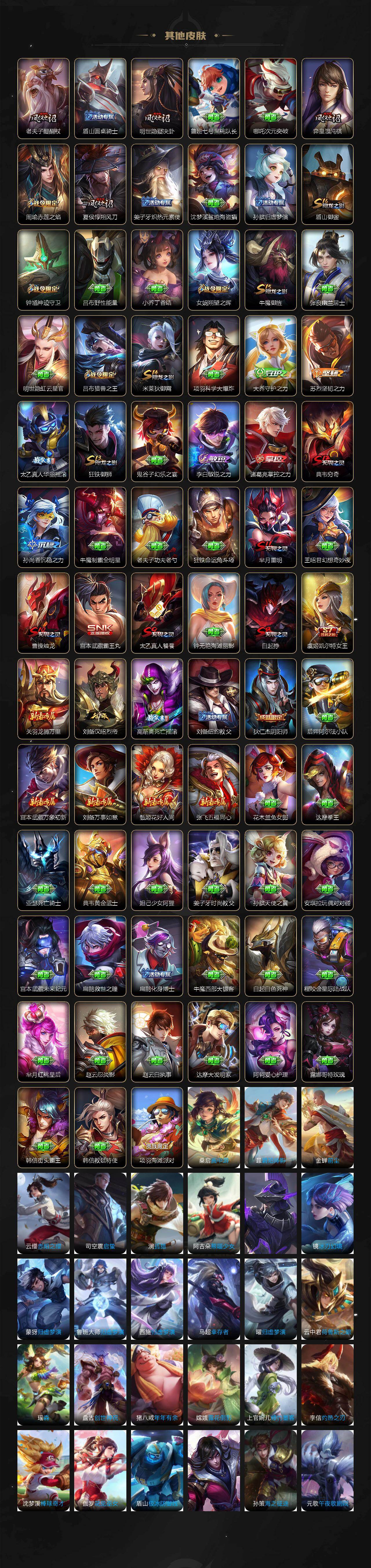 【英雄全皮】:廉颇全皮,嬴政全皮,刘禅全皮,宫本武藏全皮,孙权全皮,杨玉环全皮,女娲全皮,太乙真人全皮,鬼谷子全皮,弈星全皮,猪八戒全皮,大司命全皮,敖隐全皮,蒙恬全皮,阿古朵全皮,夏洛特全皮,司空震全皮,暃全皮,空空儿全皮,影全皮,姬小满