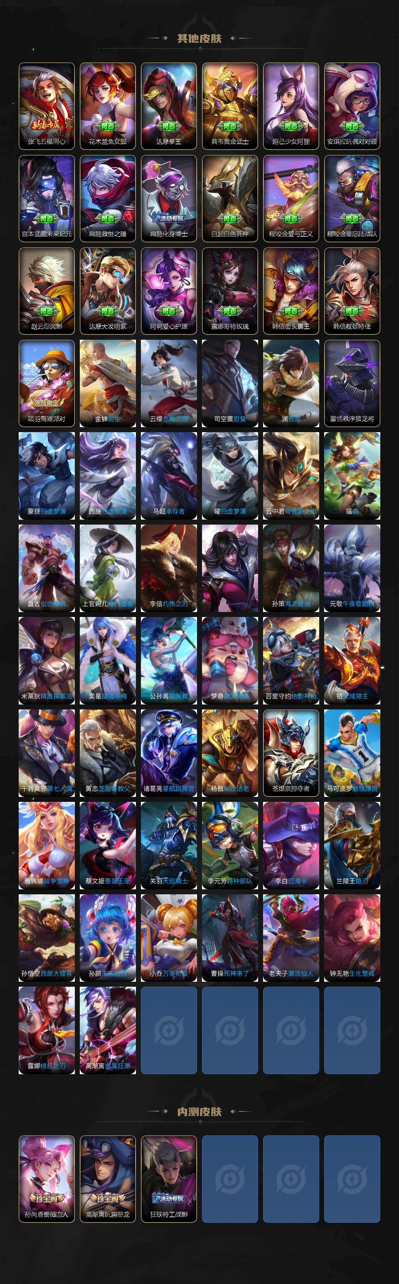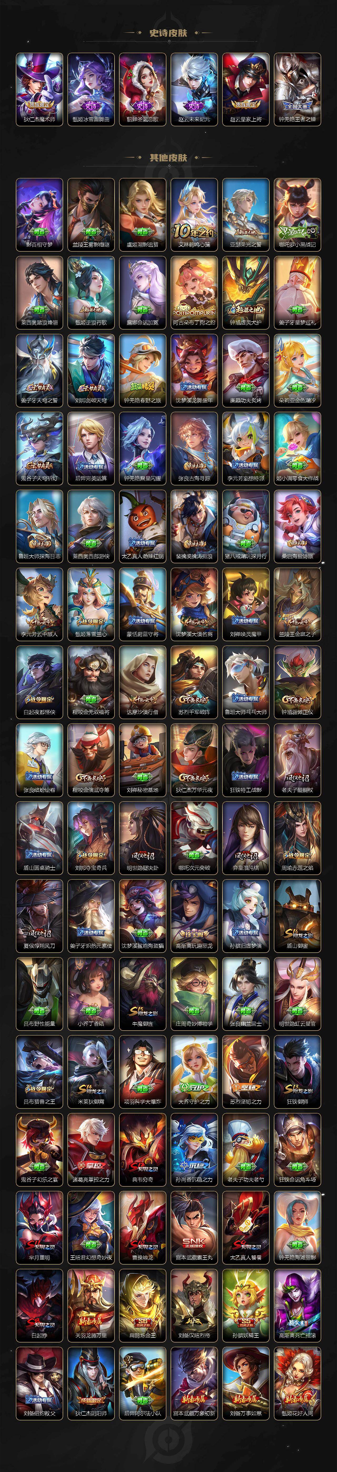 【限定皮肤】:白起狰,姜子牙天穹之誓,狄仁杰阴阳师,赵云皇家上将,嬴政白昼王子,孙尚香蔷薇恋人,高渐离死亡摇滚,高渐离玩趣恶龙,阿轲迷踪