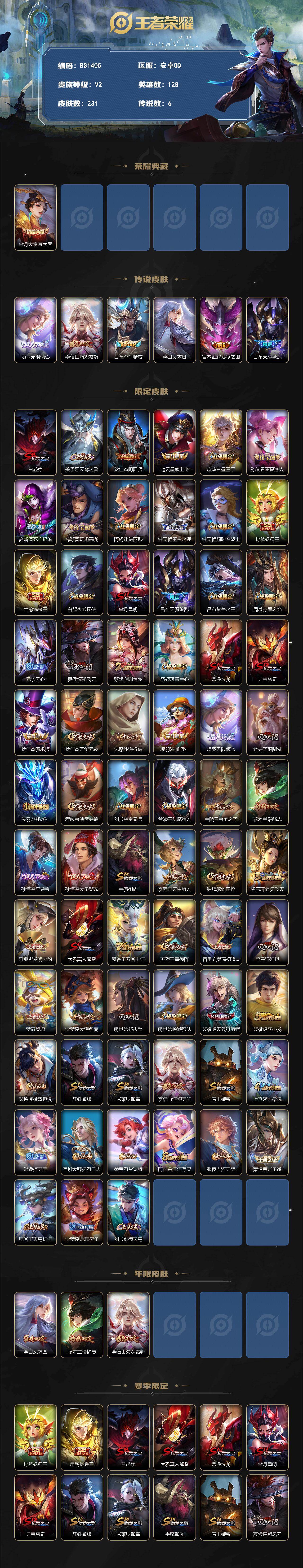 /对抗路31段!安卓Q-V7-永恒钻石II段位-128英雄-231皮肤-1典藏皮肤-6传说-64史诗