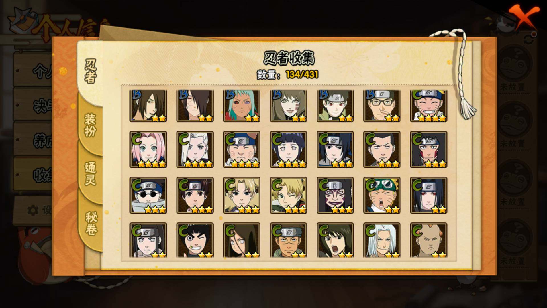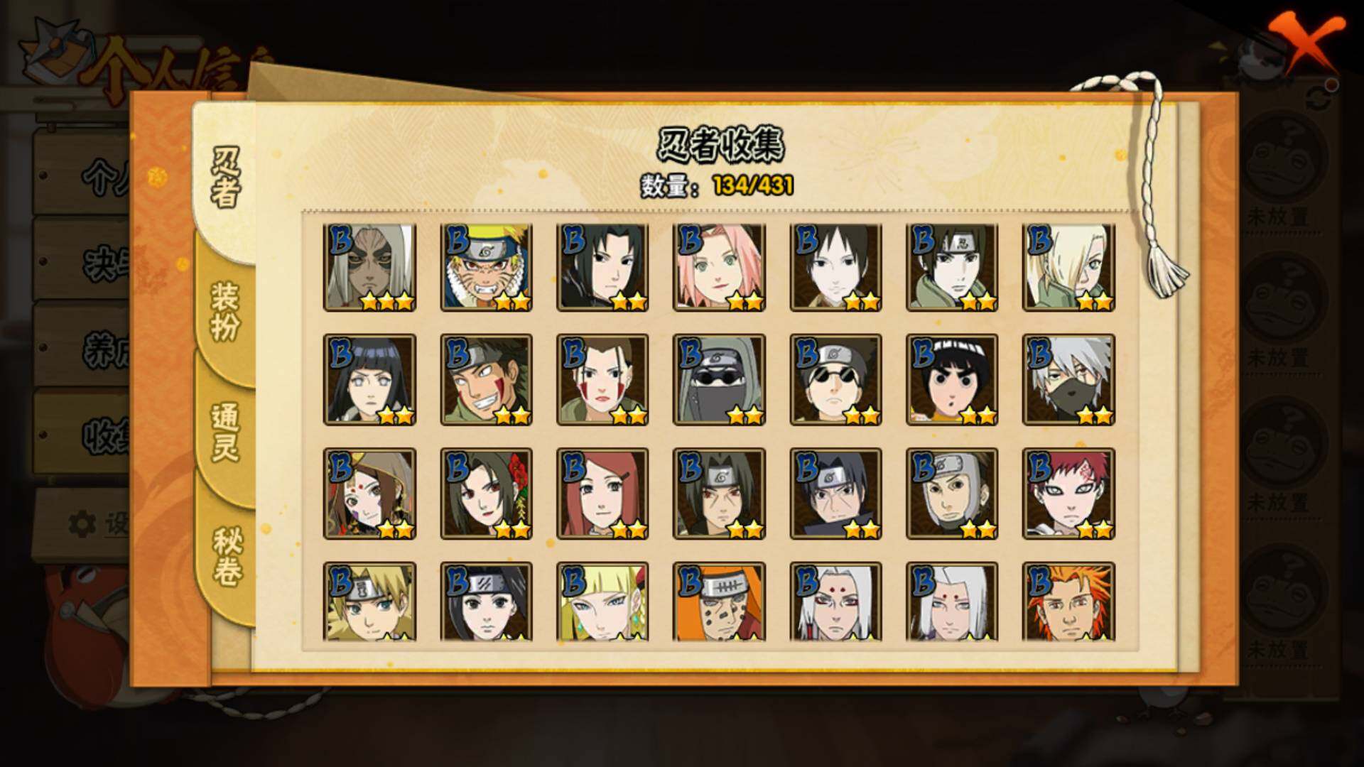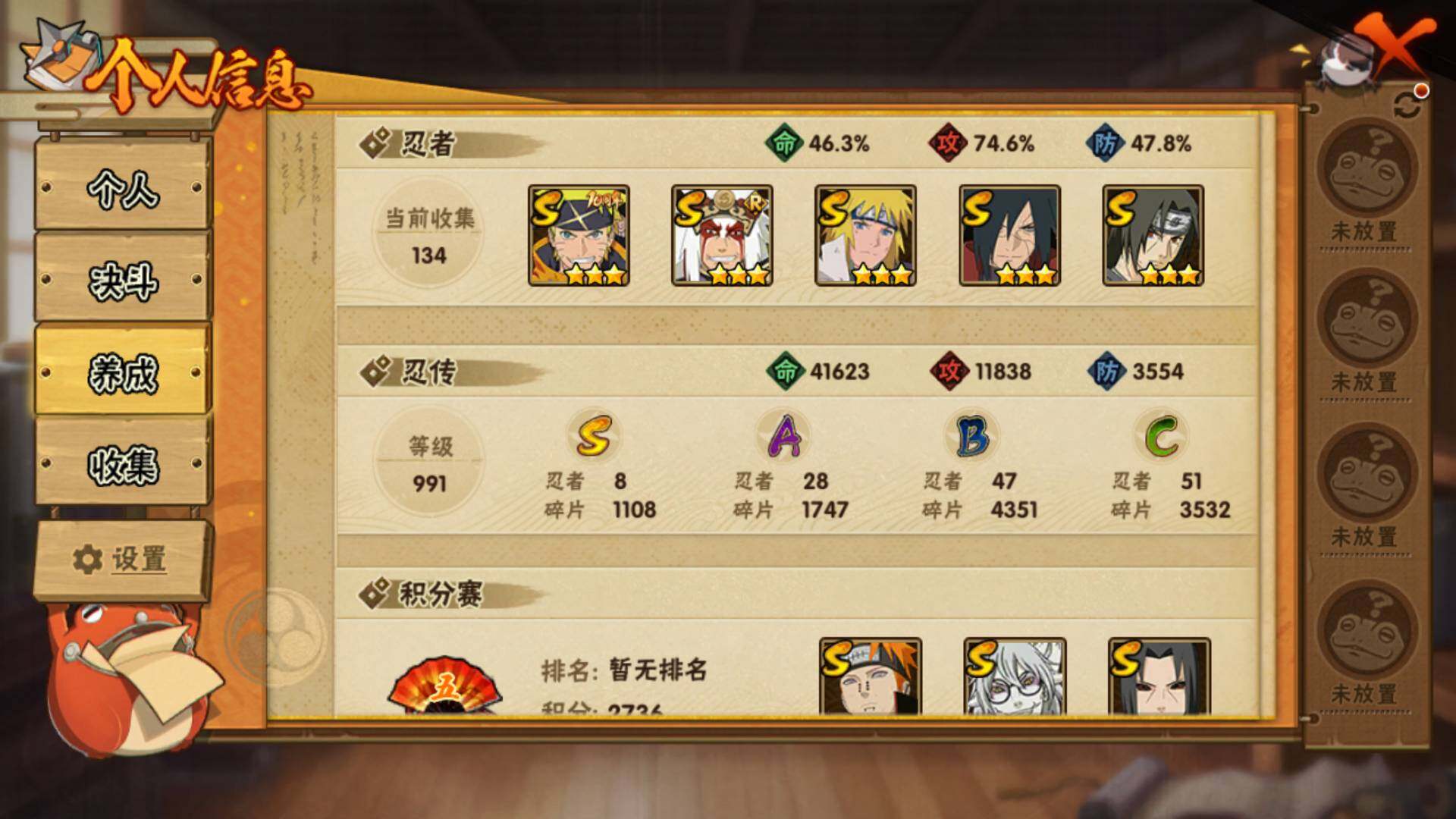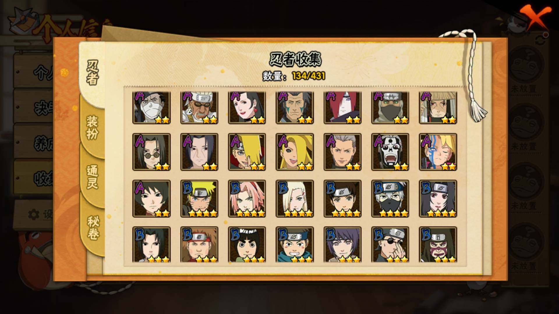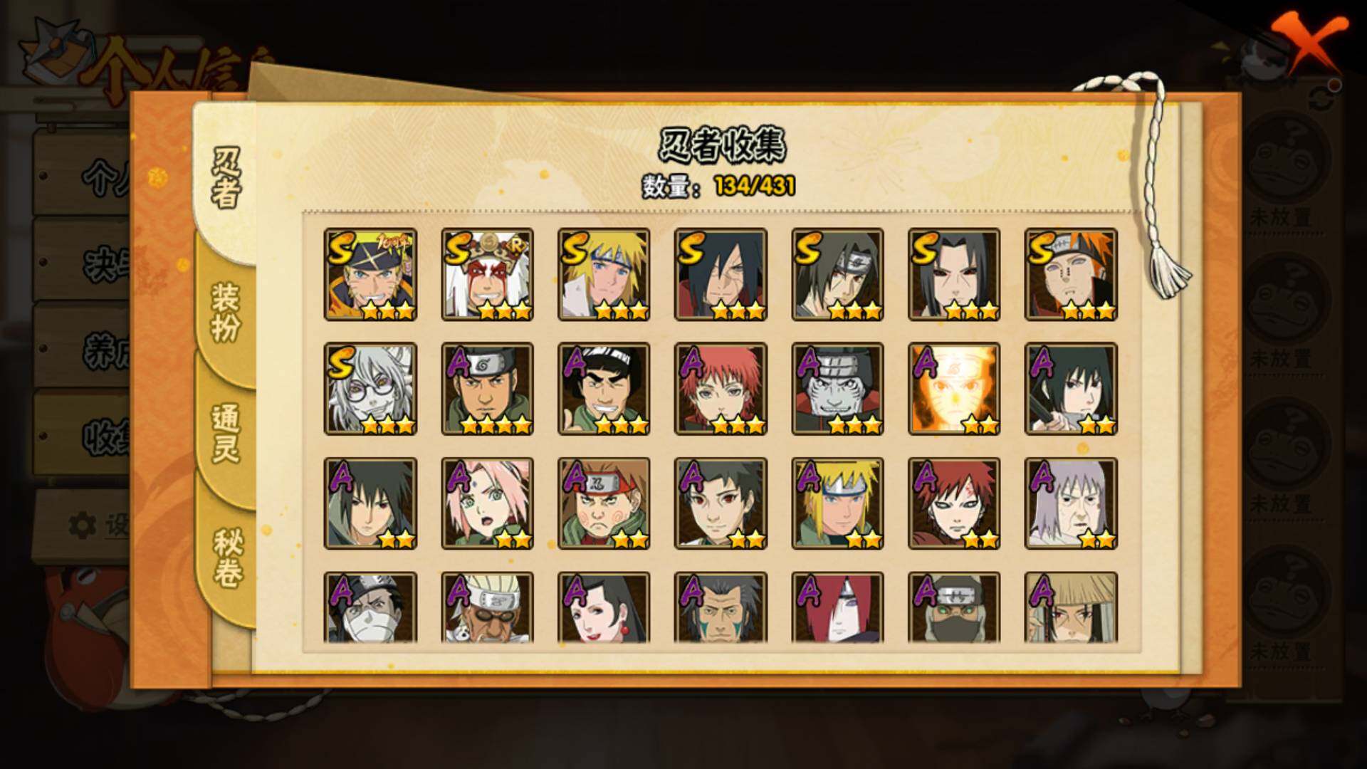 【S级忍者】:宇智波鼬「秽土转生」(3星),宇智波斑「秽土转生·解」(3星),宇智波鼬「须佐能乎」(3星),自来也「舞之豪杰」(3星),波风水门(3星),药师兜「仙人模式」(3星),佩恩「天道」(3星),漩涡鸣人·宇智波佐助(3星