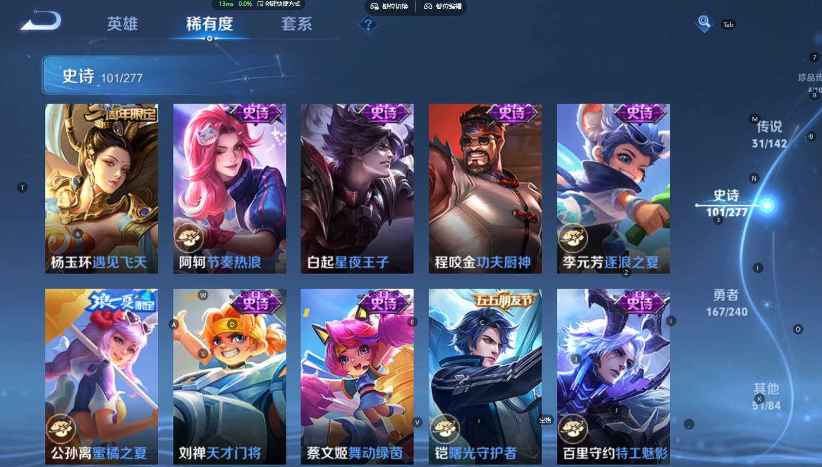 安卓Q-V7-尊贵铂金I段位-129英雄-357皮肤-2典藏皮肤-1无双-4珍品传说-31传说-100史诗