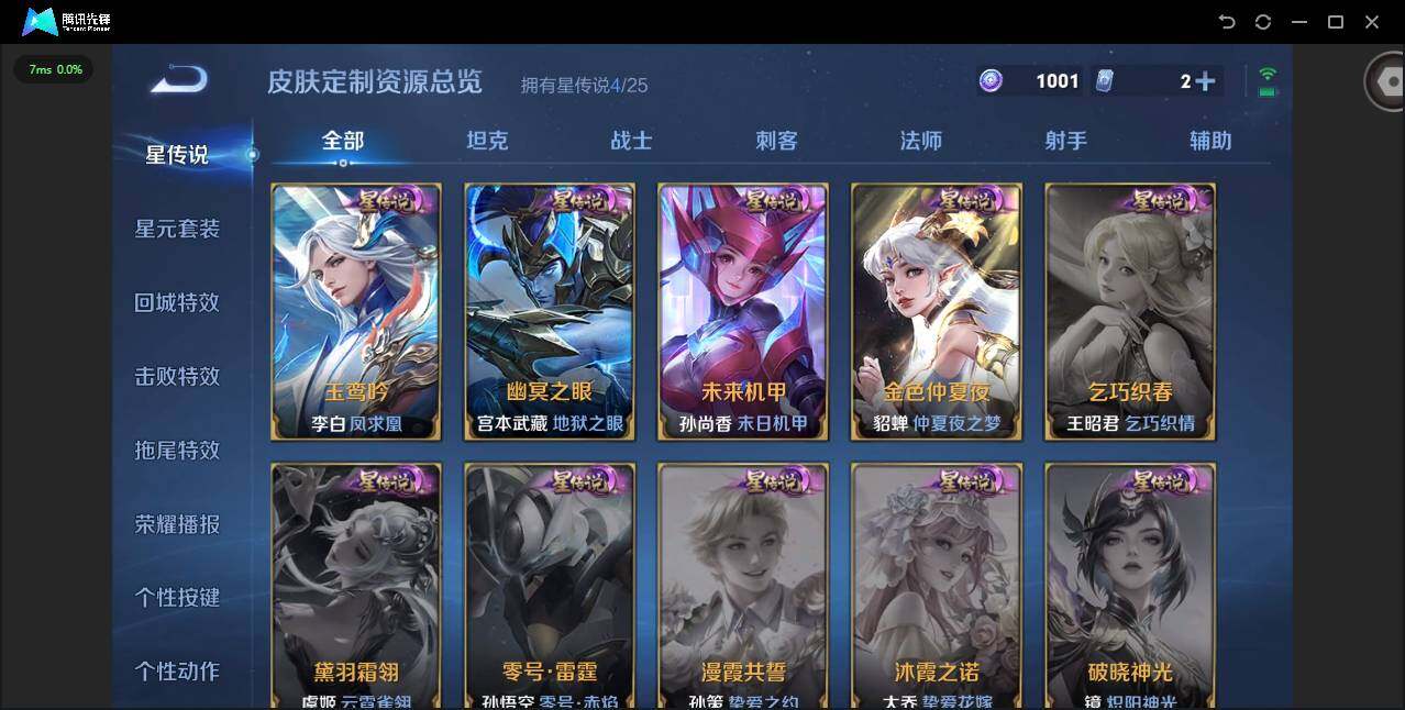 【传说皮肤】:云缨幻光神枪,孙尚香异界灵契,铠绛天战甲,镜炽阳神光,虞姬启明星使,伽罗太华,貂蝉猫影幻舞,干将莫邪久胜战神,虞姬云霓雀翎,达摩黄金狮子座,百里玄策白虎志,后羿黄金射手座,诸葛亮武陵仙君,貂蝉仲夏夜之梦,李白凤求凰,