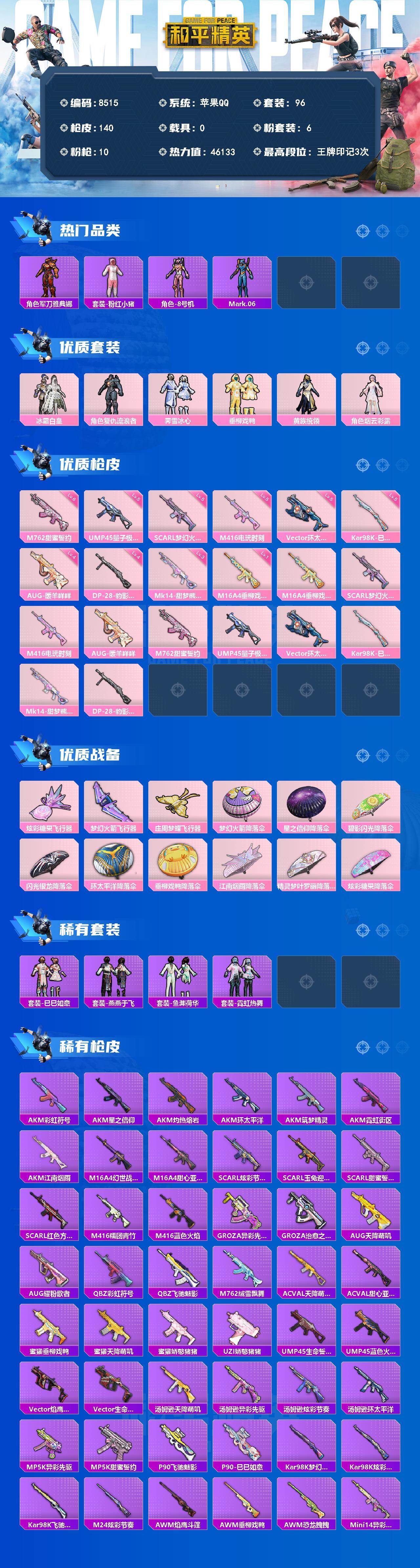 【8515】6粉装-10特效枪-0载具-3粉色飞行器-46133热力值-3王牌印记-96套装-140枪皮