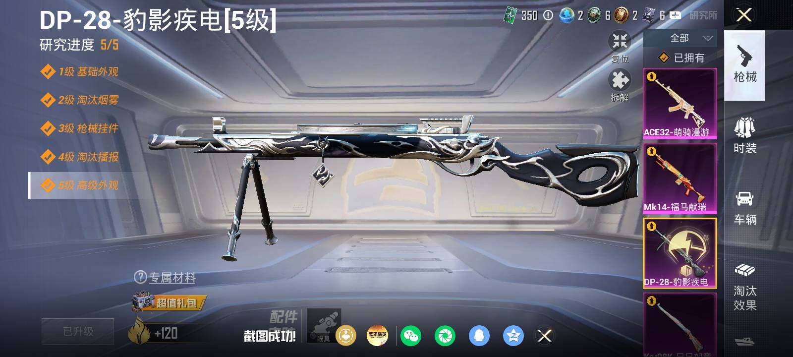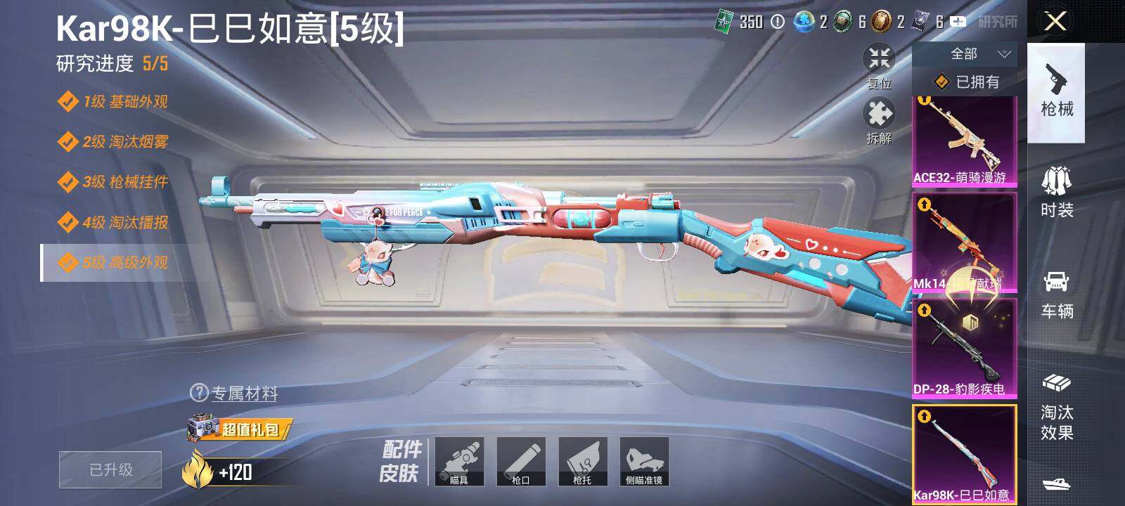 【粉色枪皮等级】:ACE32-萌骑漫游(五级),Kar98K-巳巳如意(五级),Mk14-福马献瑞(五级),DP-28-豹影疾电(五级)