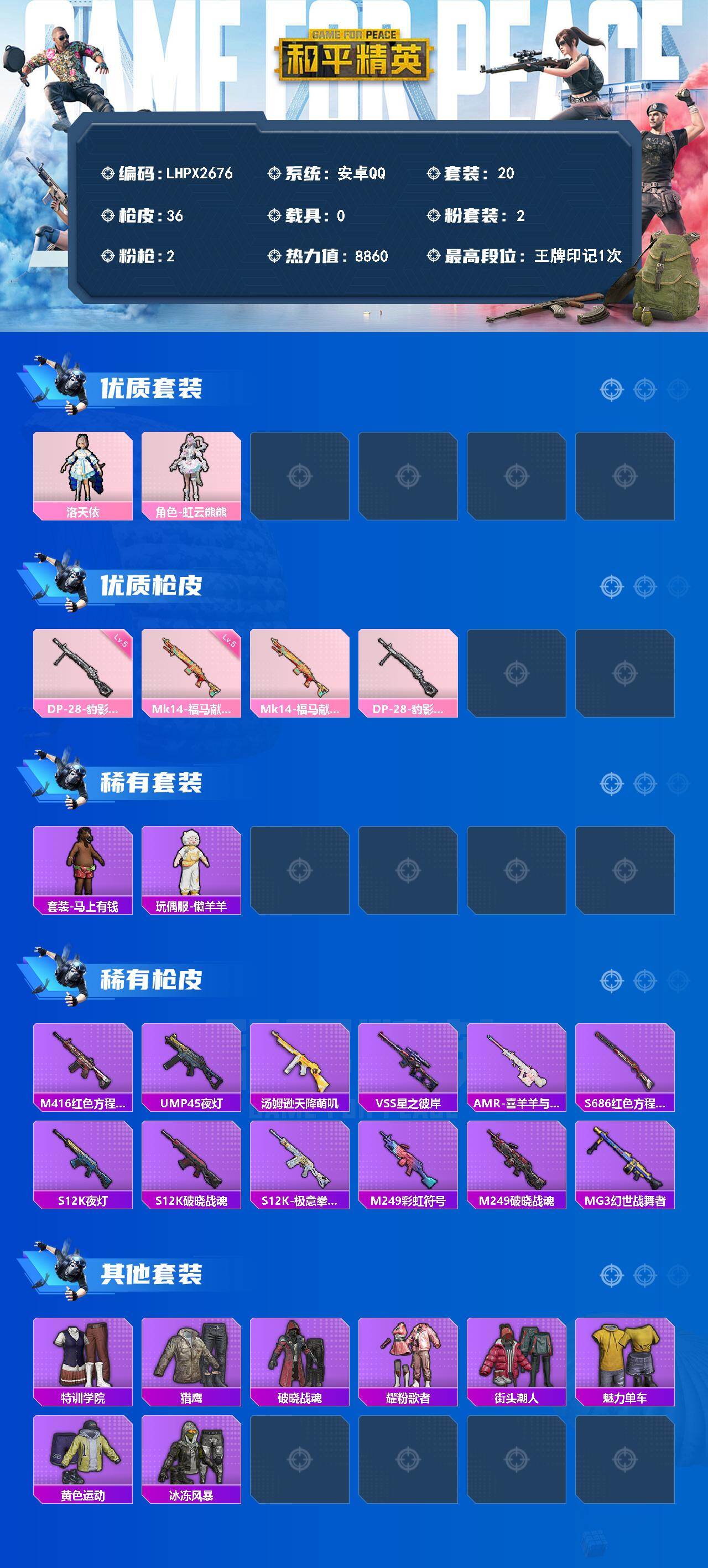 精品小号【特价出售/店主推荐--热门套装洛天依】安卓 手Q-2粉装-2特效枪-8860热力值-1王牌印记-20套装-36枪皮【粉色套装】:角色-洛天依,角色-虹云熊熊【粉色枪皮等级】:Mk14-福马献瑞(五级),DP-28-豹影疾电(五级)