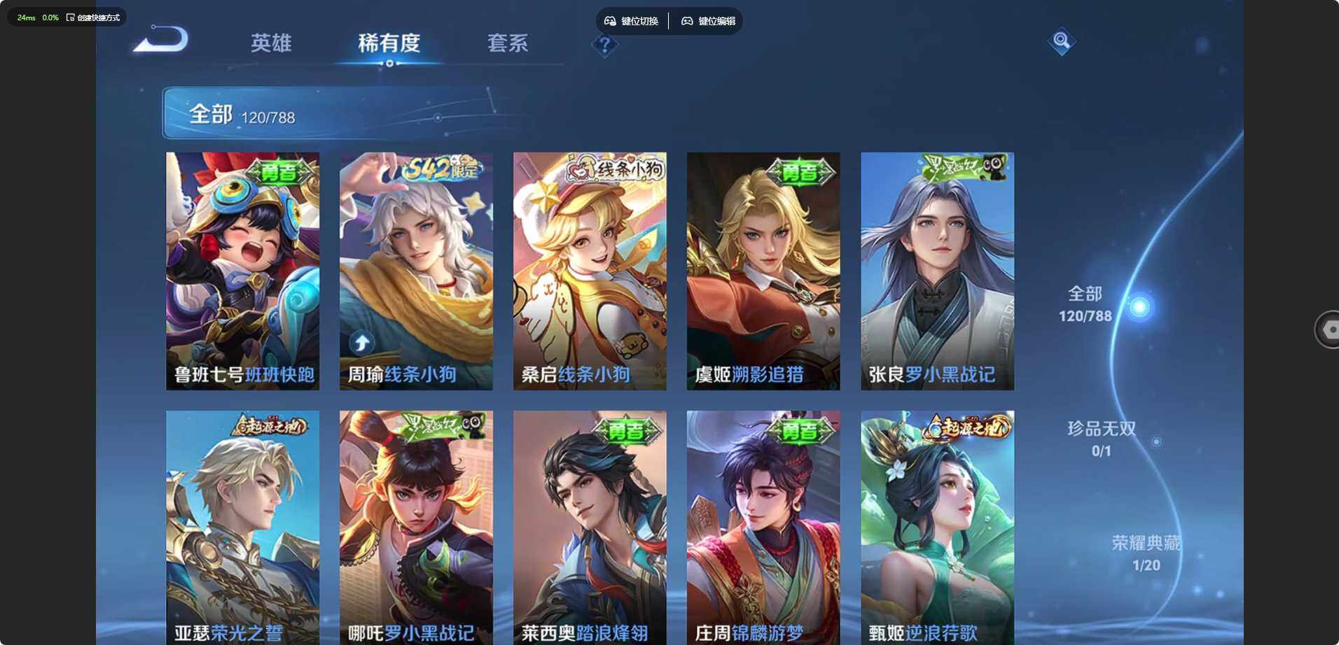 实名: 可修改 贵族等级: V6 英雄数: 126 皮肤数: 120 荣耀水晶