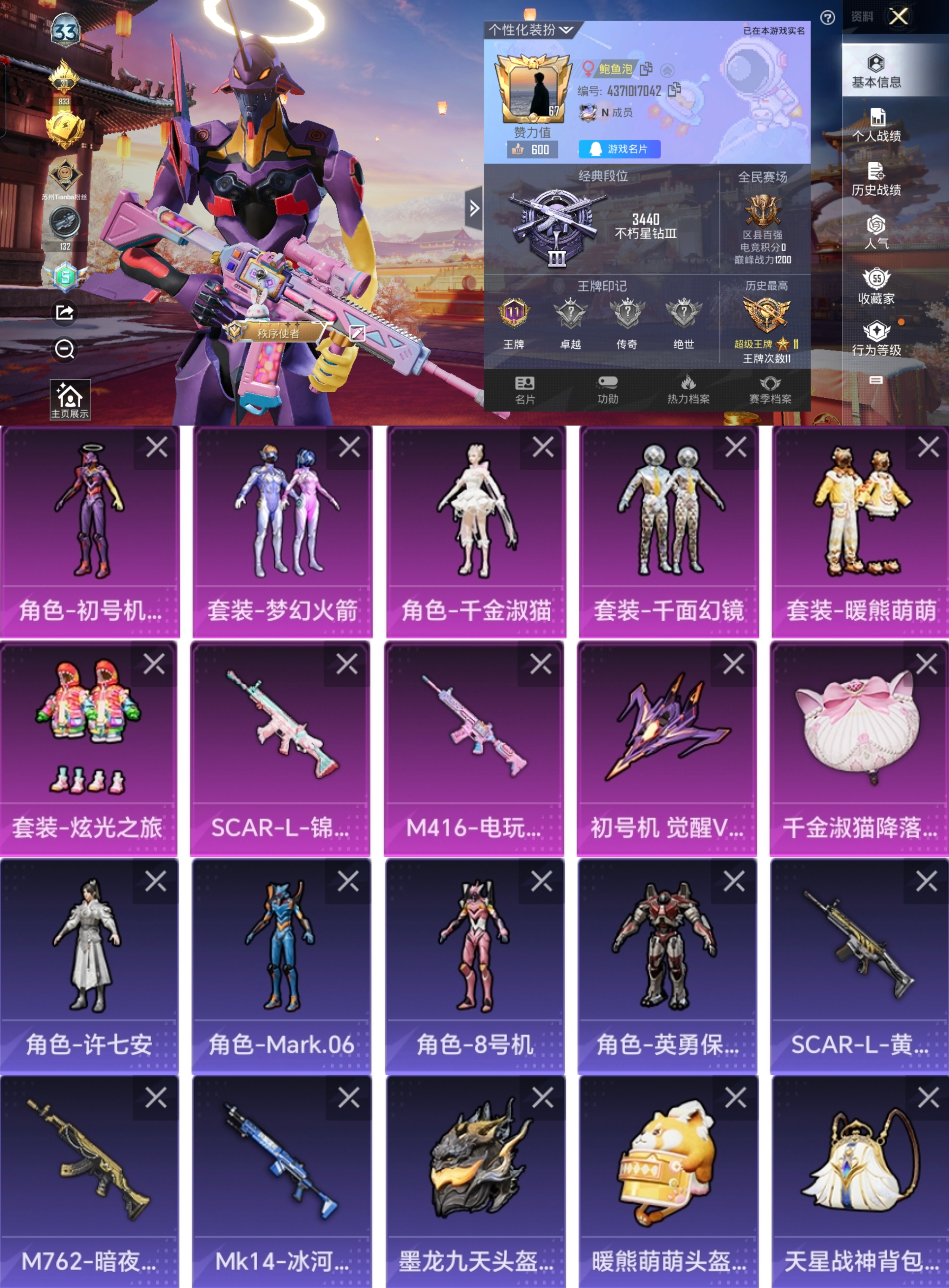 LGH325【6粉2特1螳螂初号机觉醒ver千面幻镜梦幻火箭暖熊萌萌蓝螳螂素材号】(可二次实名) 安卓Q-54047热力值 11王牌印记 历史超级王牌11星 131套装 168枪皮 【6粉装】 觉醒初号机 梦幻火箭 千金淑猫 炫光之旅 千面幻镜 暖熊萌萌 【2特效枪】 SCAR-L-锦绣绵绵 (5级) M416-电玩时刻 (5级) 【9热门】 8号机 Mark.06 雪山精英 呆萌铁蟹 奶芙汪汪