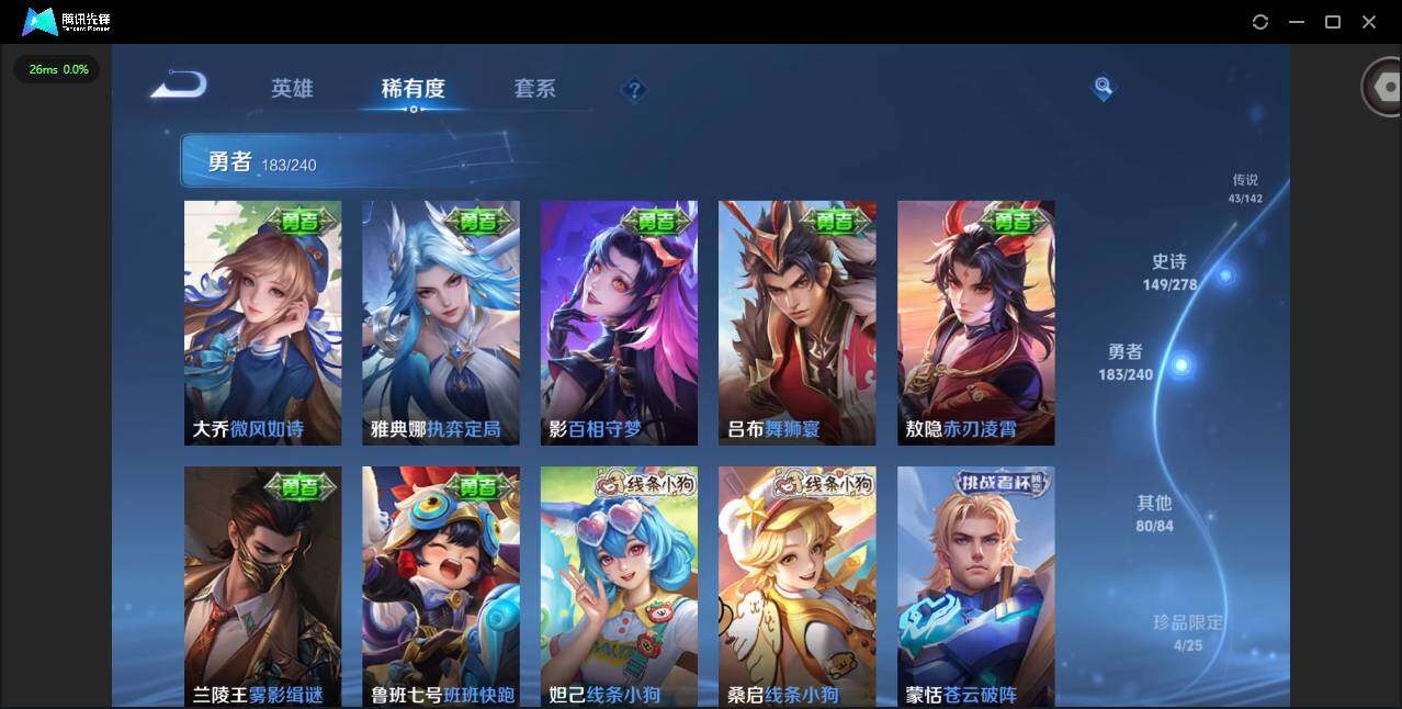 实名: 可修改 贵族等级: V10 英雄数: 129 皮肤数: 462 荣耀水