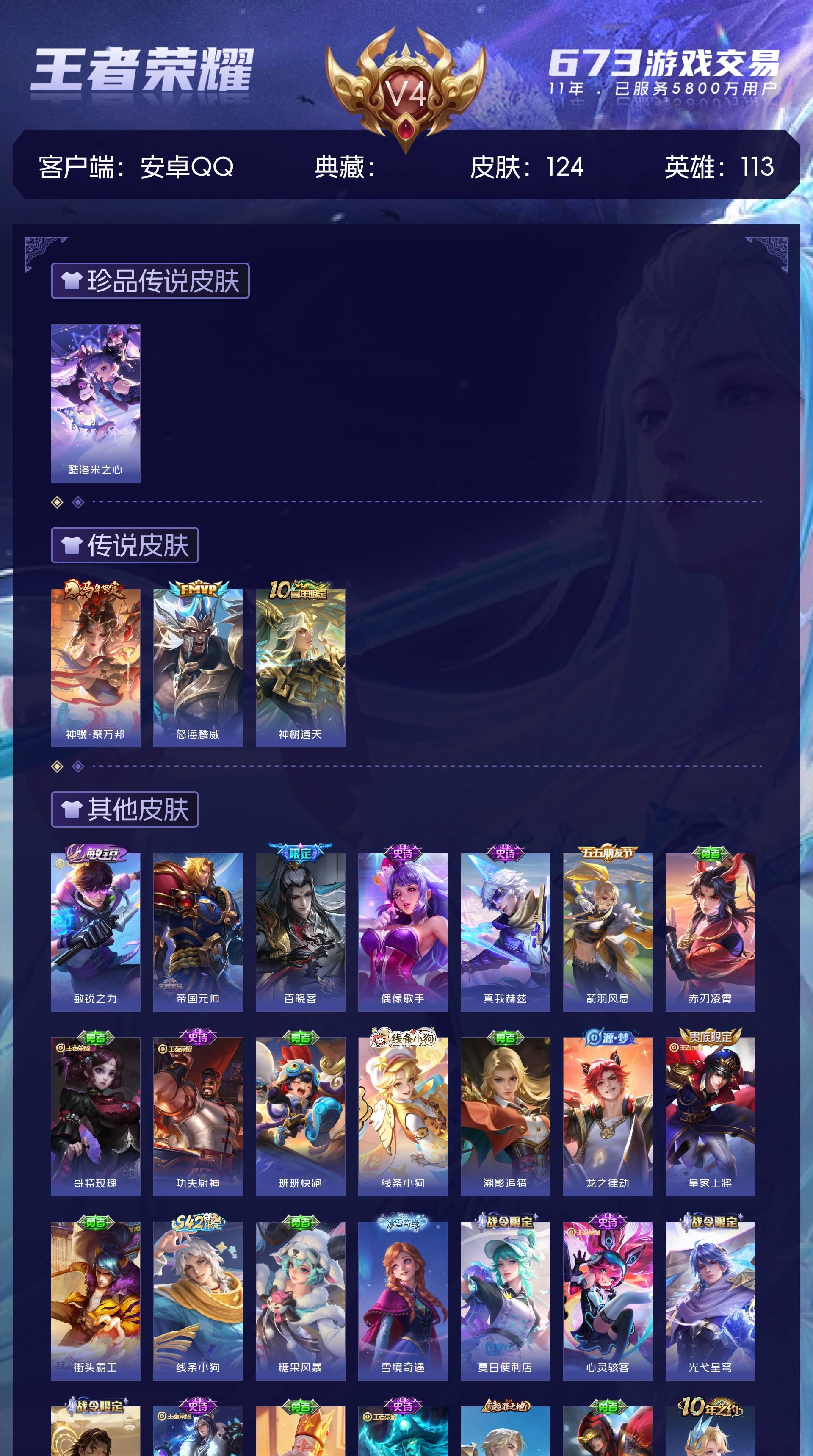 V4 皮肤124 英雄113 永恒钻石 珍品传说1 星传说1 传说3