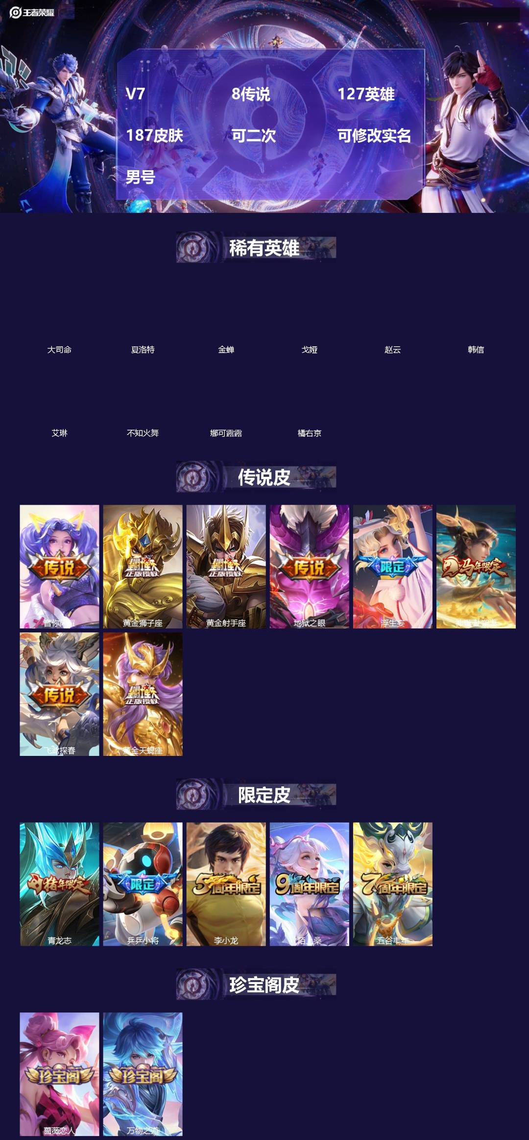 V7 8传说 127英雄 187皮肤 可二次 可修改实名 男号