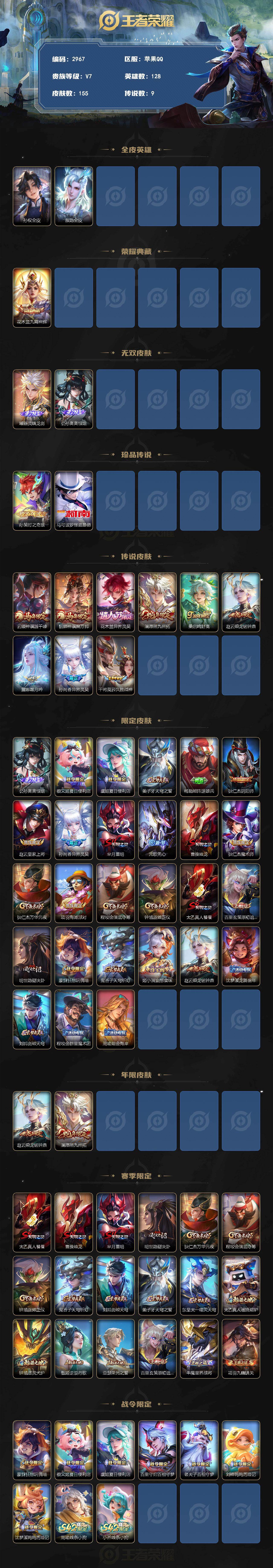 苹果Q-V7-永恒钻石III段位-128英雄-155皮肤-1典藏皮肤-2无双-2珍品传说-9传说-44史诗