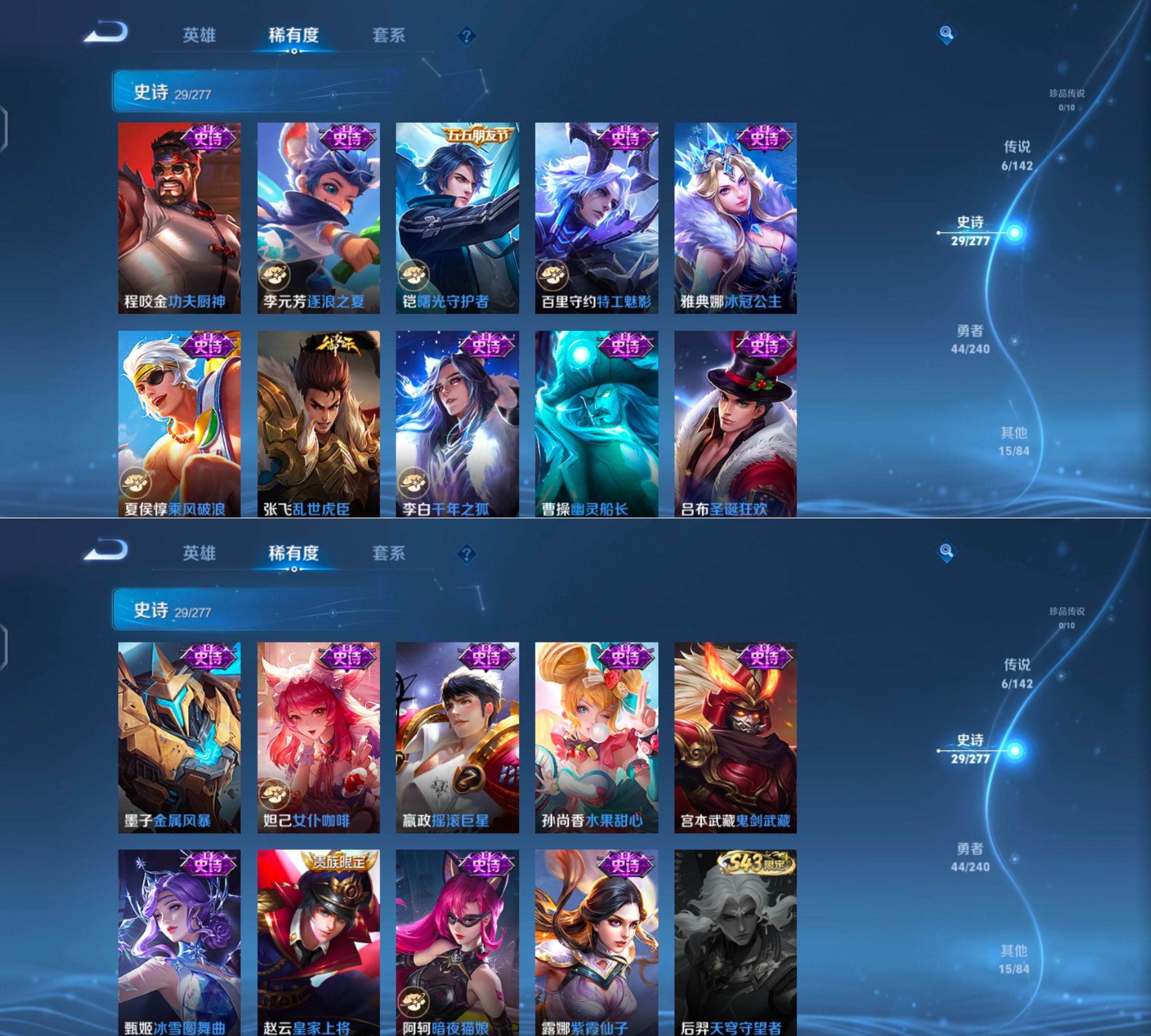 【史诗皮肤】 百相守梦 涂山容容 线条小狗 决胜大满贯 魅语 幽灵船长 繁星吟游 功夫厨神 女仆咖啡 鹰眼统帅 鬼剑武藏 曙光守护者 千年之狐 逐浪之夏 紫霞仙子 圣诞狂欢 暗影游猎 金属风暴 李小龙 水果甜心 乘风破浪 冰冠公主 遇见飞天 摇滚巨星 乱世虎臣 皇家上将 冰雪圆舞曲 无心 暗夜猫娘 特工魅影
