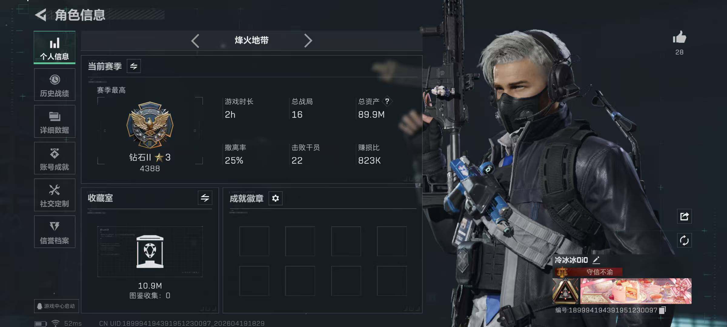 89m总资产-691k哈夫币-60烽火等级-钻石-30战场等级-上等兵