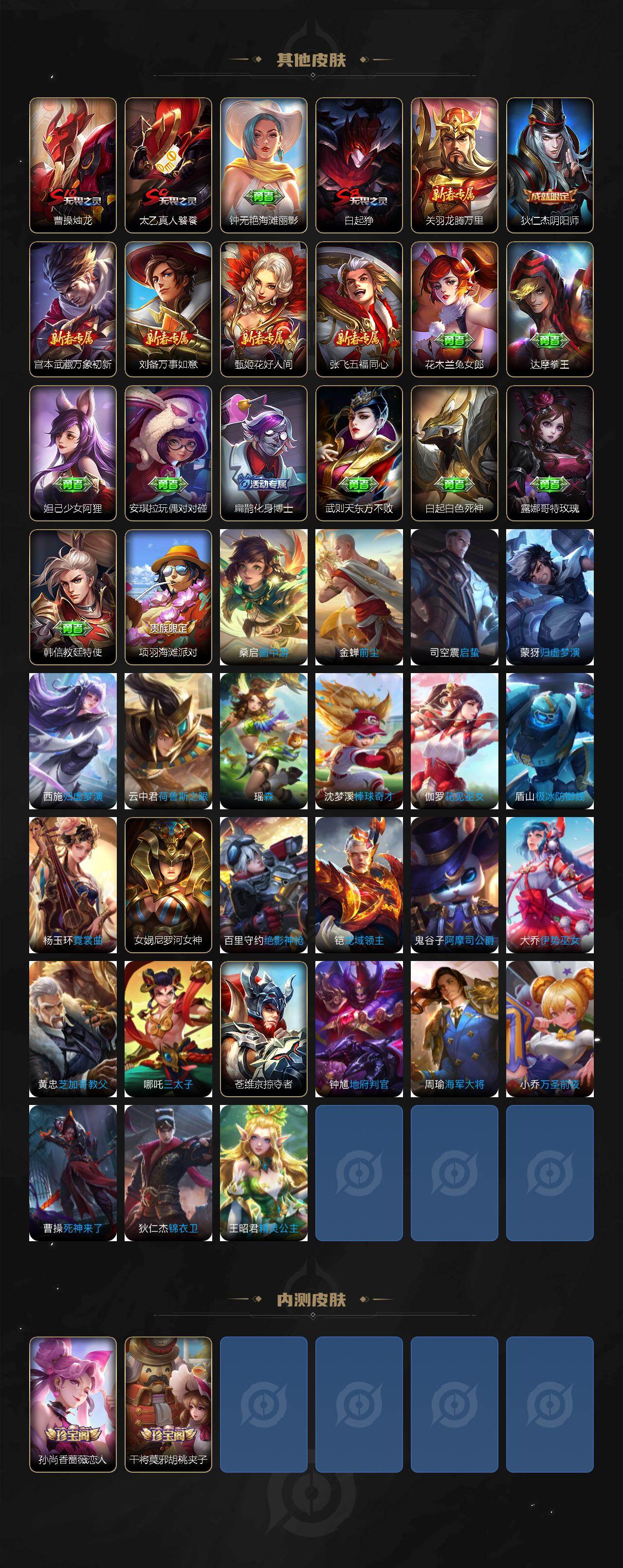 【传说皮肤】:后羿神树通天,蔡文姬愿照福禄聚,桑启鸣野蒿,庄周牧神诗旅,瑶时之祈愿,裴擒虎寅虎赤拳,鲁班七号寅虎瑞焰,诸葛亮时雨天司,铠绛天战甲,虞姬启明星使,孙悟空零号赤焰,百里玄策白虎志,梦奇胖达荣荣,后羿黄金射手座,诸葛亮武陵仙君,貂蝉仲夏夜之梦