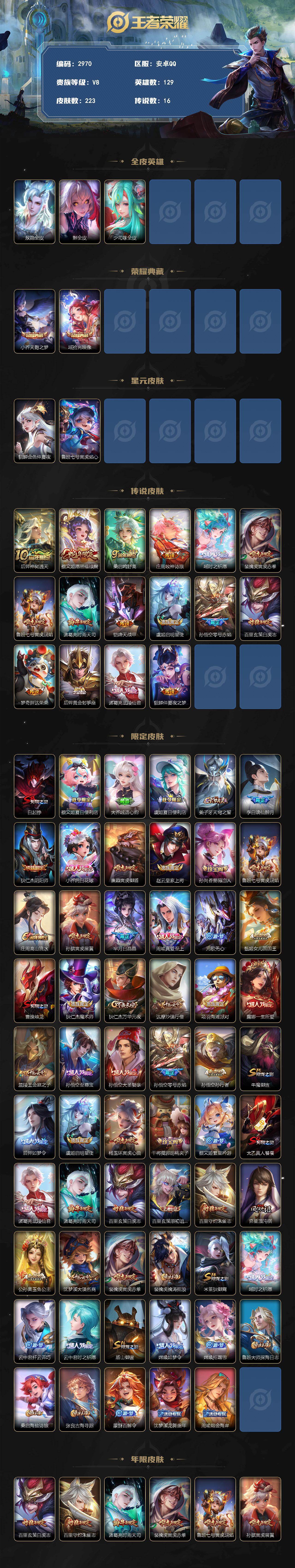 【漂亮女号小乔瑶典藏16个高质量传说多限定2星传说13个个性按键】安卓Q-V8-最强王者段位-129英雄-223皮肤-2典藏皮肤-16传说-74史诗