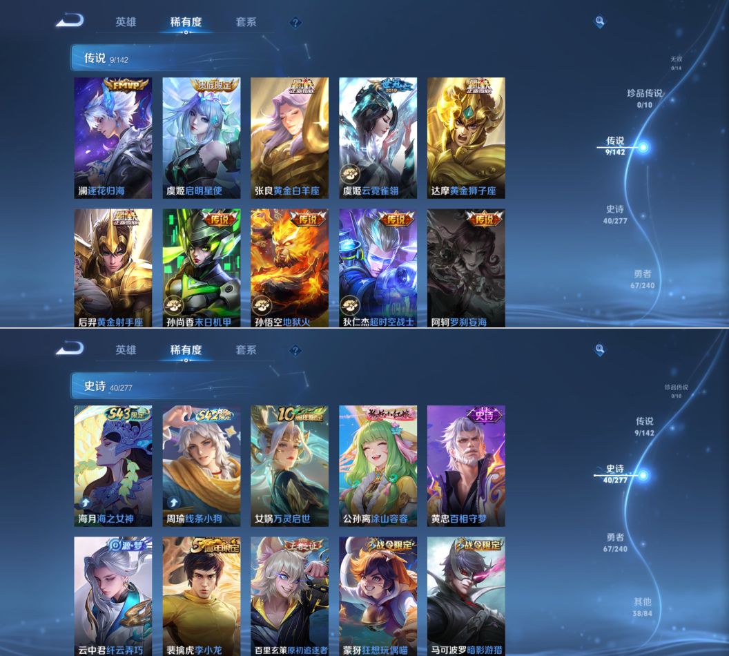 【史诗皮肤】 天狼征服者 岱宗 飞衡 涂山容容 至尊宝 线条小狗 威尼斯狂欢 罗小黑战记 海之女神 踏浪烽翎 百相守梦 死神来了 万灵启世 繁星吟游 魅力维加斯 魔术师 鹰眼统帅 无限星赏官 鬼剑武藏 水晶猎龙者 曙光守护者 驯魔猎人 千年之狐 银河之约 地狱岩魂 暗影游猎 狂想玩偶喵